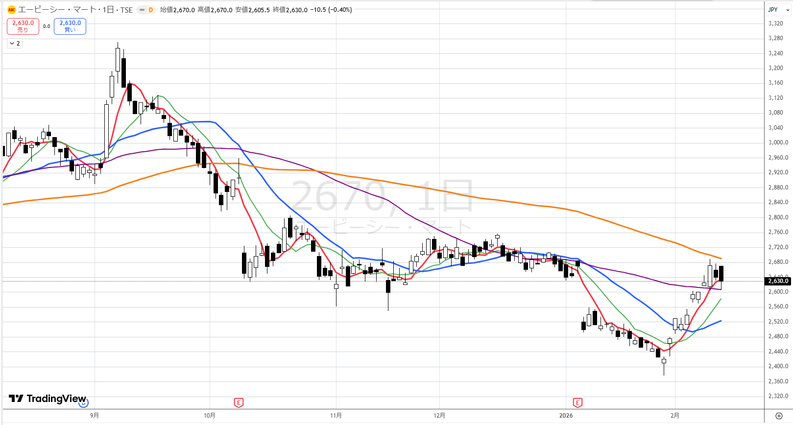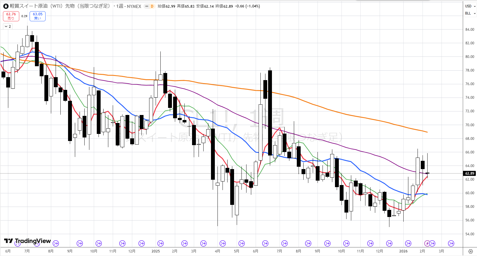 週足では紫とオレンジの間に株価が入り込み、その中で上げ下げしています。