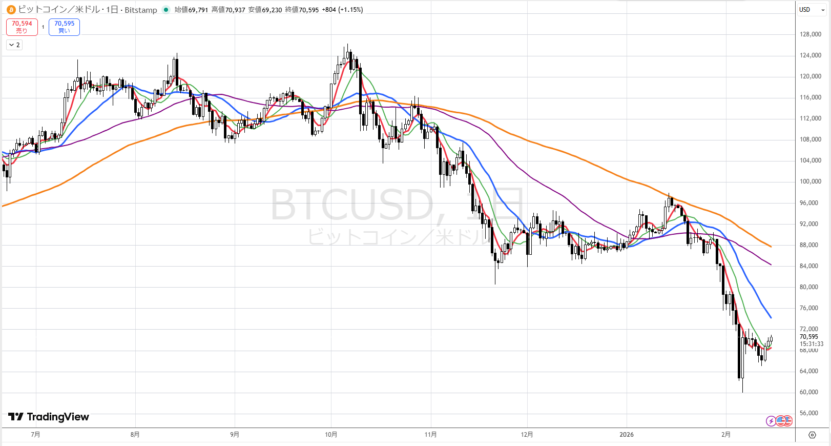 紫と青の間くらいとなると、「24500ドル割れくらいまであってもおかしくない」と、相場先生は話していました。