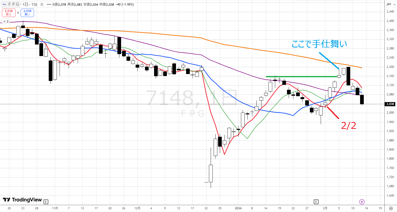 7148FPGですが、2/2に下半身が出たので買いを入れ、本日、100日線が気になるのですが、前回の高値を超えたので買いを追加しました。相場先生の見解を教えてください。