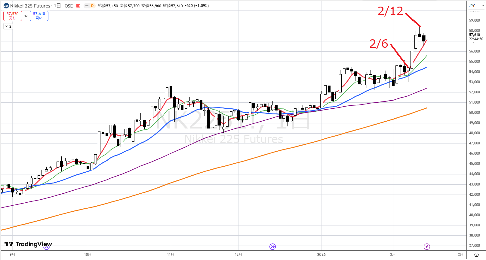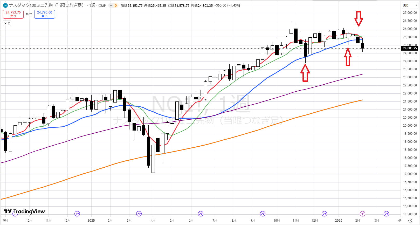 ただし、オレンジの100週線や紫の50週線まで下げることは、普通は考えられません。