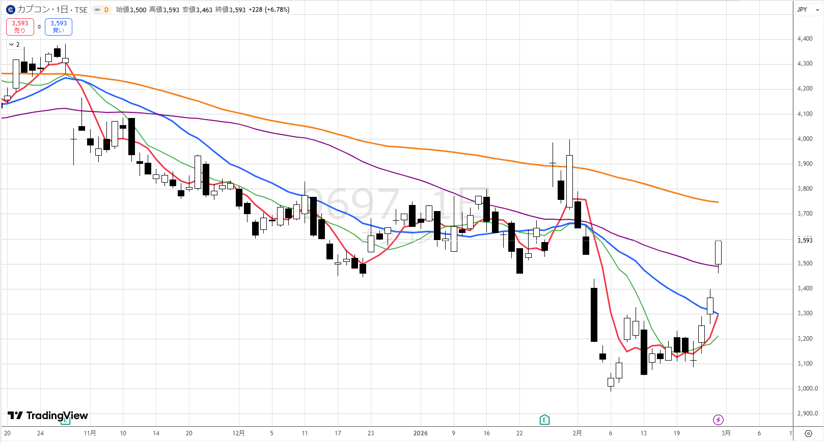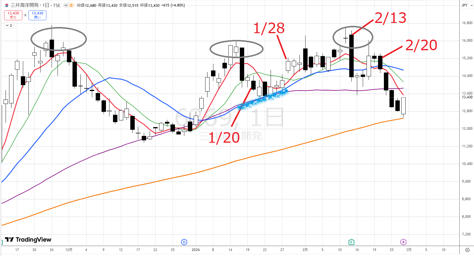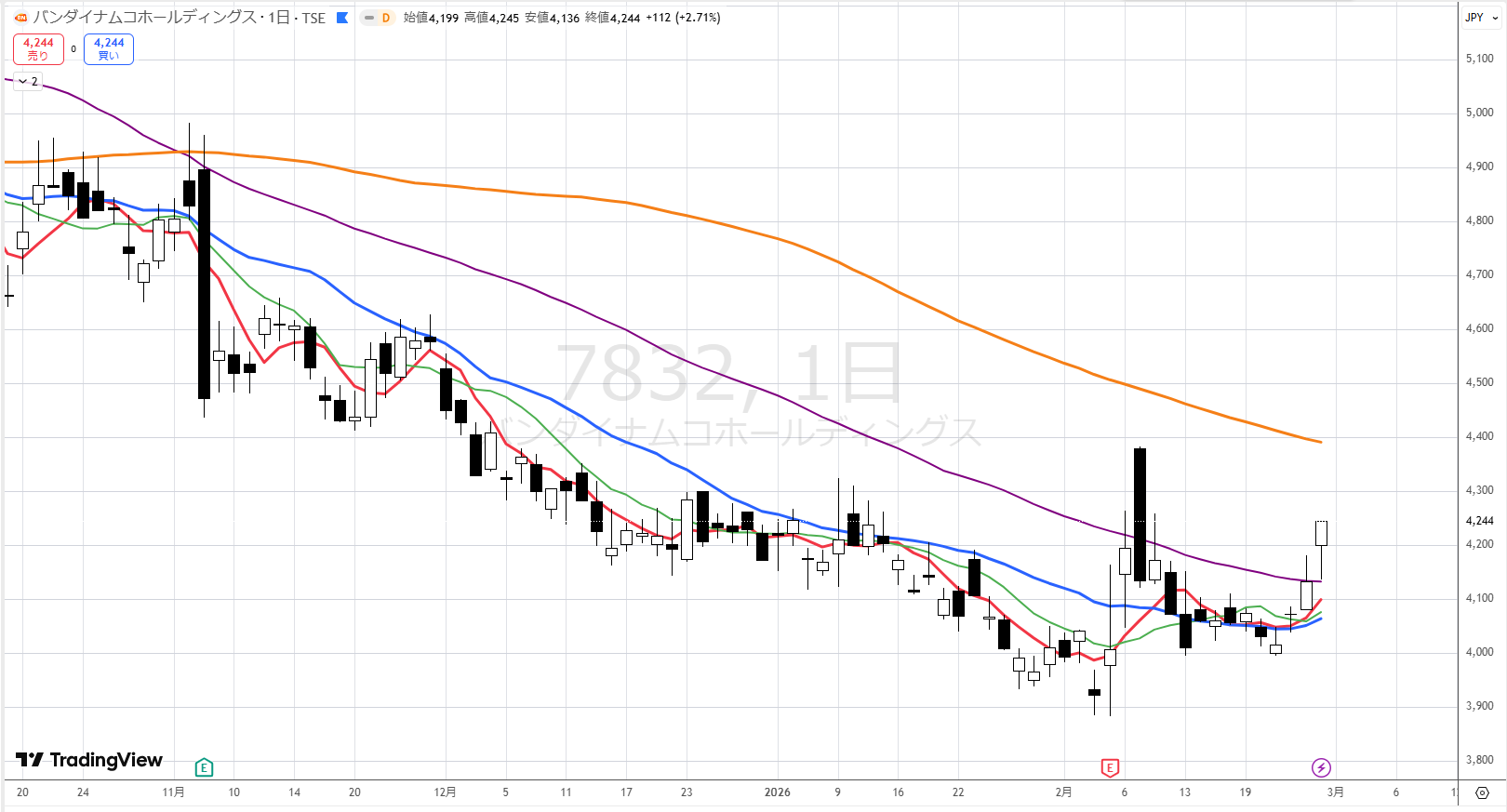 我慢です。2/20の時点の移動平均線の順番が、下からオレンジ、紫、青、緑、赤で、赤の角度が急です。緑も上を見ています。これは大丈夫なんです。