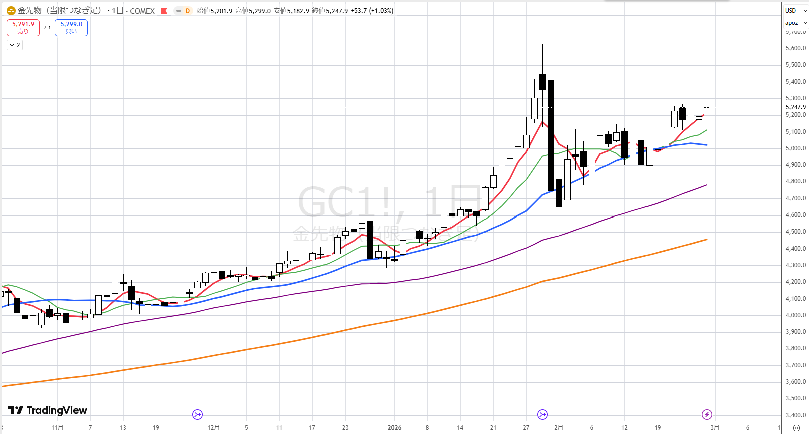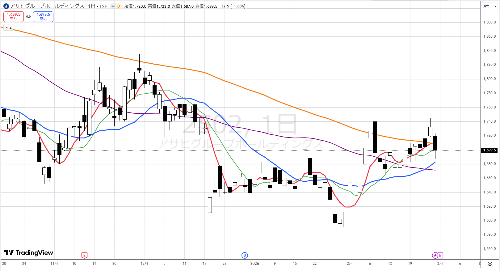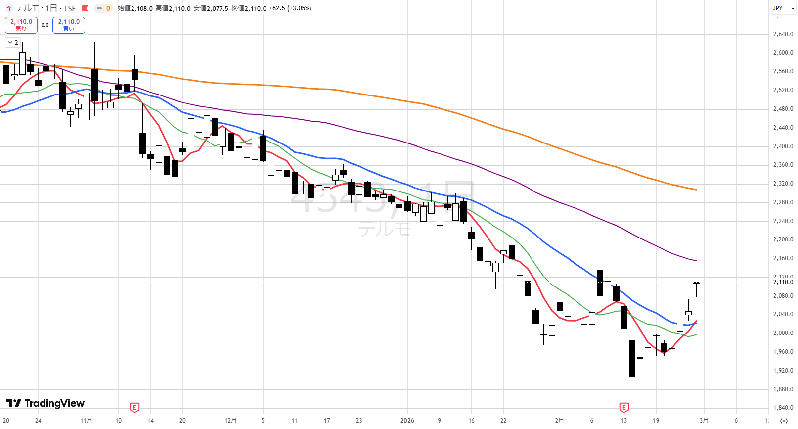 我慢です。2/20の時点の移動平均線の順番が、下からオレンジ、紫、青、緑、赤で、赤の角度が急です。緑も上を見ています。これは大丈夫なんです。