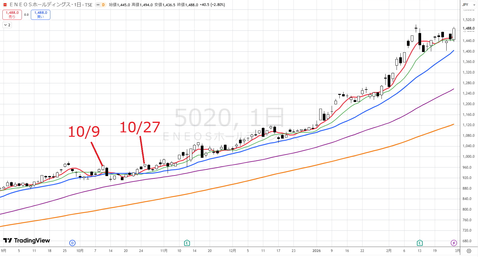 5020ENEOSについてですが、10/9、10/27にて直近高値を超えると考え、買いを入れました。その後、それぞれ少し下げながらも順調に上げていましたが、現在1450円付近まで上げている状況です。玉の追加などせず上げている状態ですが、一度利確すべきでしょうか?週足、月足もまだ上げているのではないかと思いますが、参考となる価格もなく判断に迷っています。