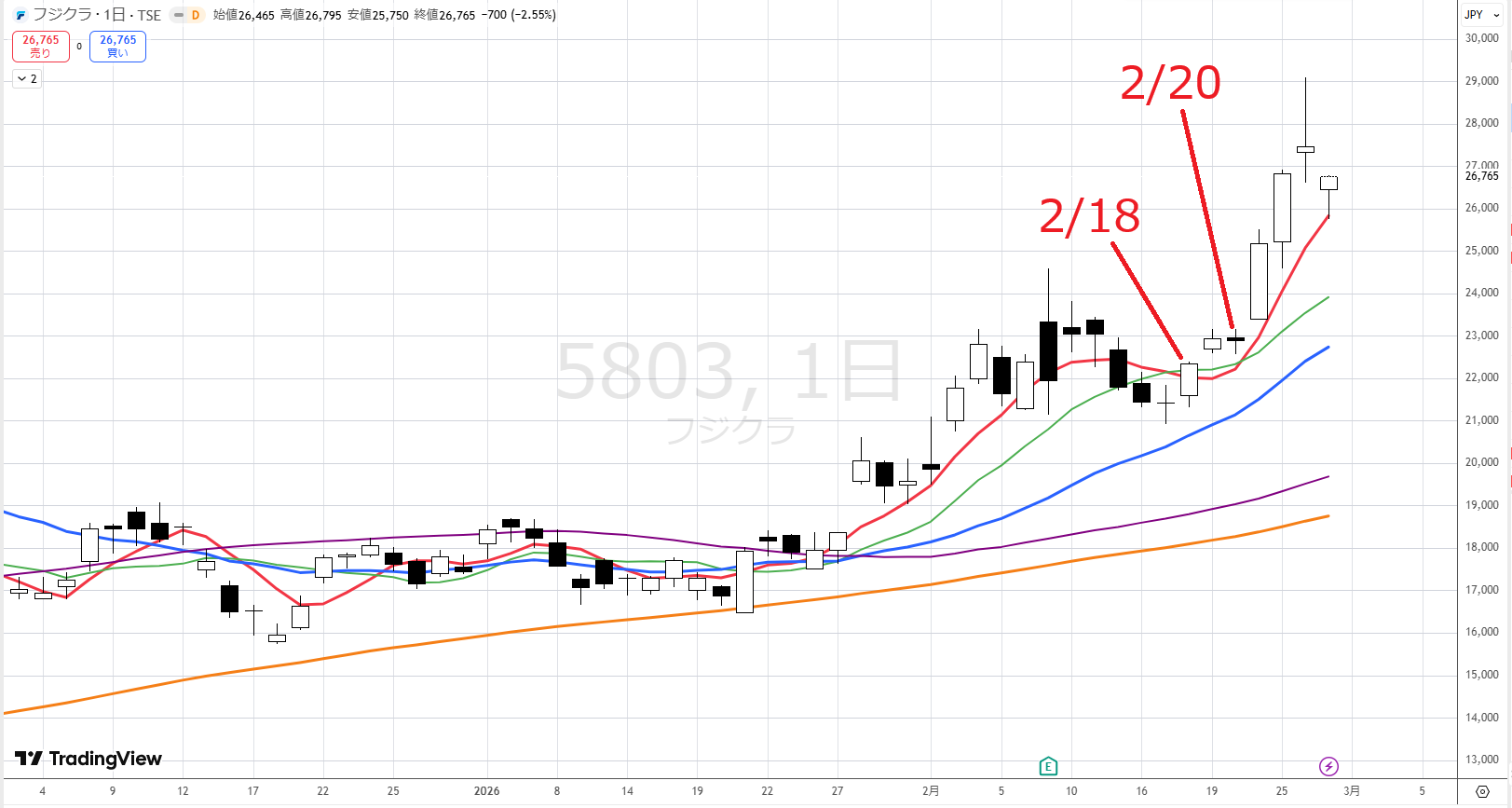 5803フジクラですが、2/18の下半身を引けの成り行きで買いました。2/20の陰線が2/4の上ヒゲと並んでいたので手仕舞いました。ですが、その後、本日まで大幅に上昇して毎日悔しいです。今回のような場合、2/20の陰線は赤に当たっていないので我慢すべきだったでしょうか?