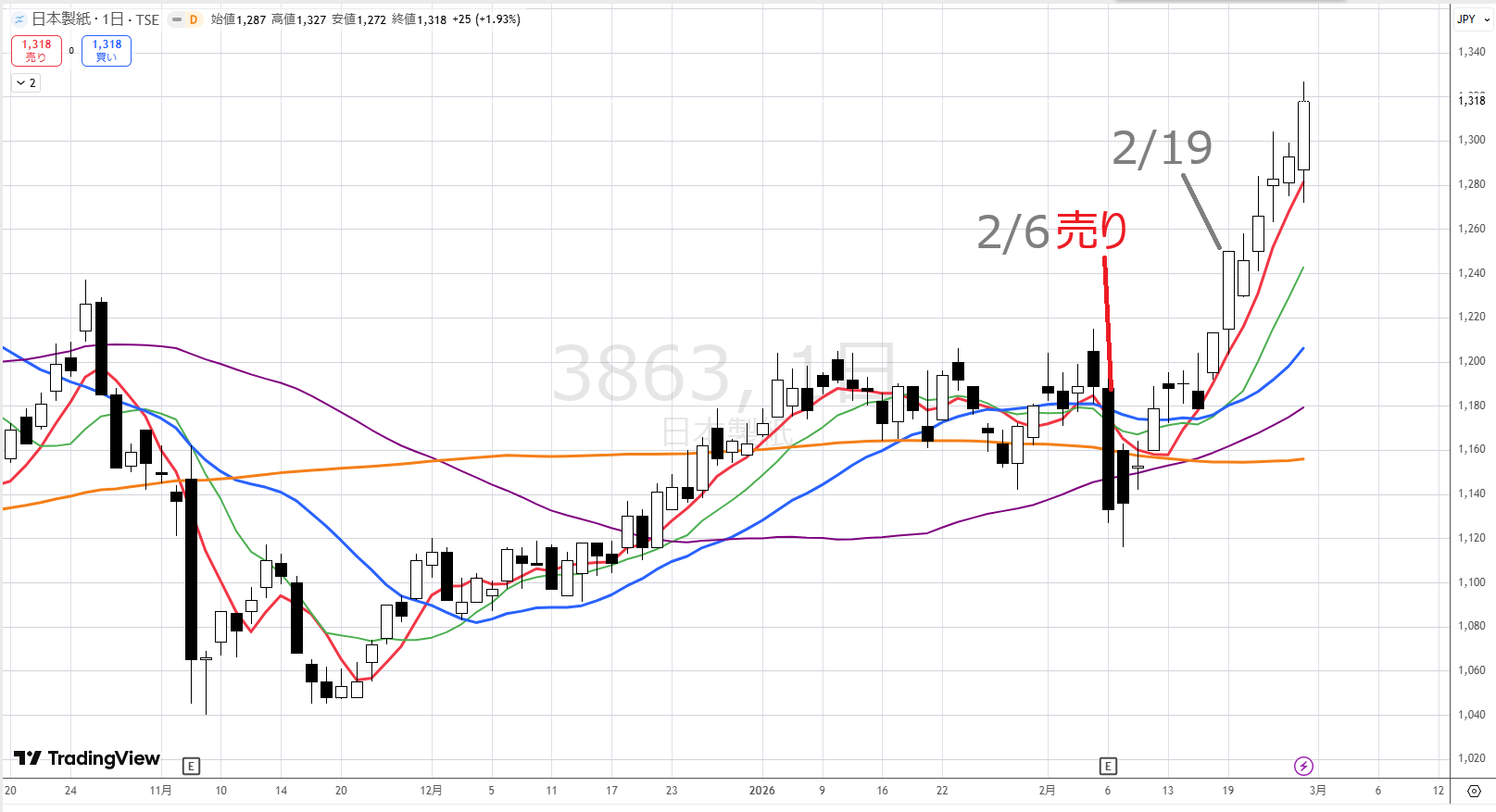 2/13の陰線で売って跳ね返されたら我慢して、2/20で追加です。