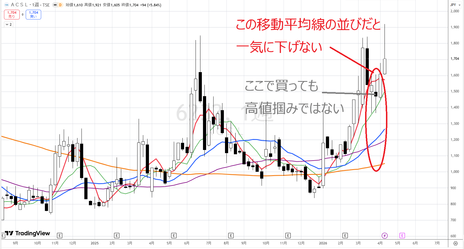 週足の青と紫は急角度で下を向いていますので、いま上げている株価はやがて下がります。ということは、日足でガンガン上げてるように見えても、これは「やがて下げるための上げ」となります。