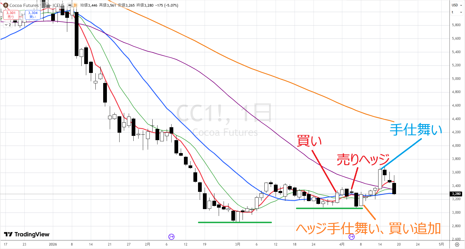 なぜヘッジを入れたかというと、3/2に最安値を付けた後に青まで上昇しているため、3/31で買った人は次の下げは前の安値まで行かないだろうという目星がつけられるから。