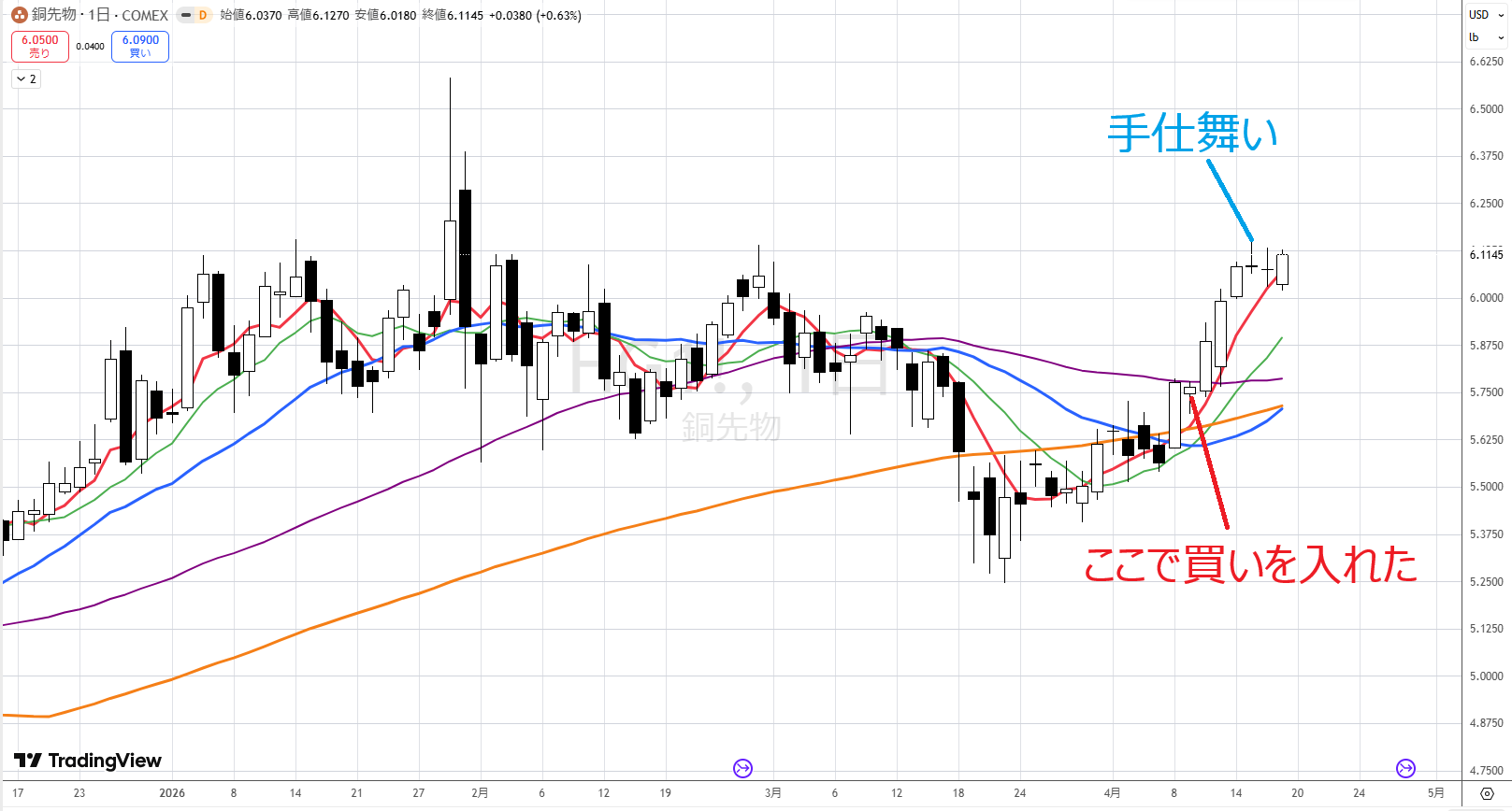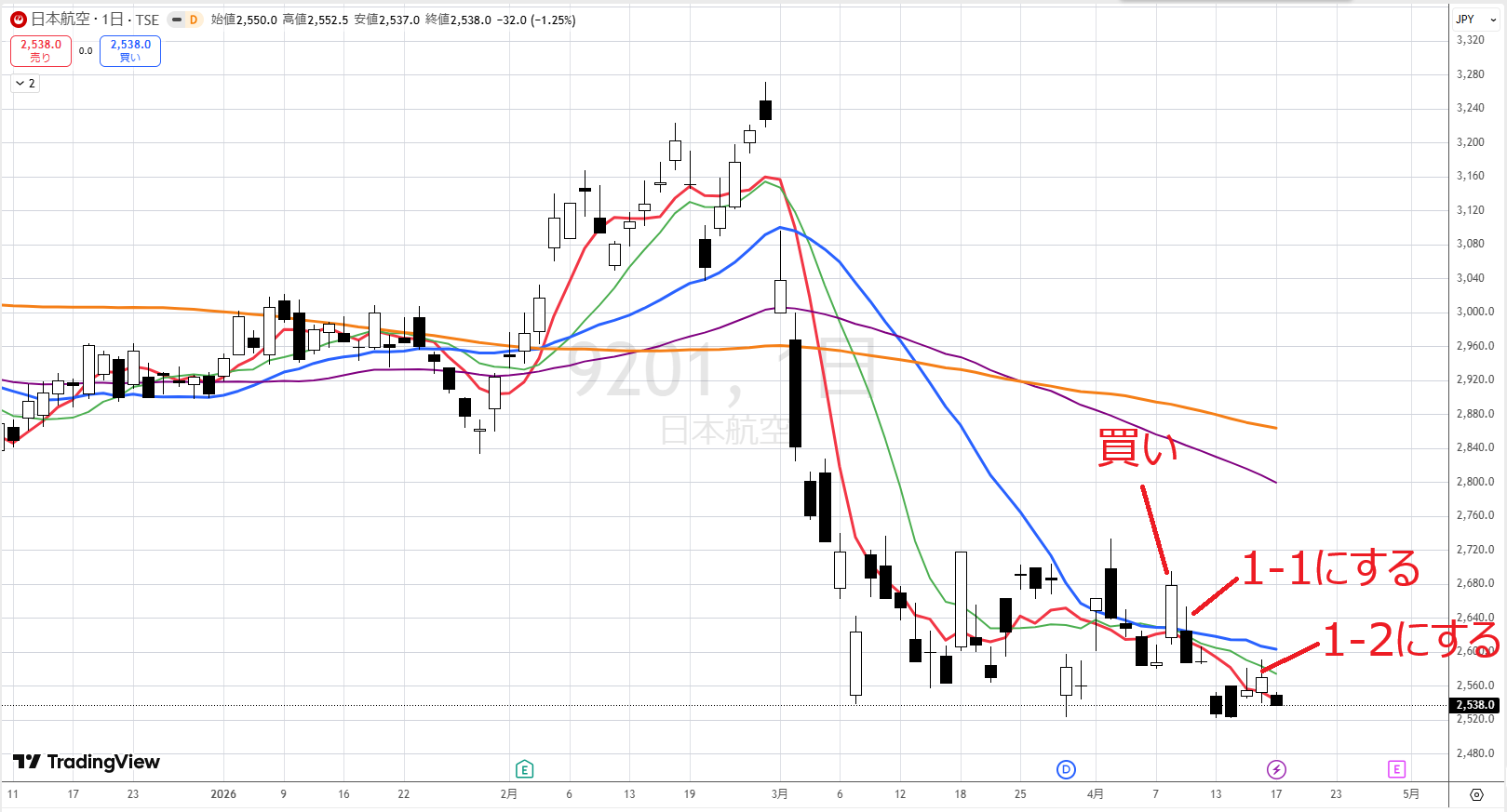4/2の段階で高値掴みをしたということは、下落手前のどこかで買ったのでしょう。そこで「売りを入れたほうがよい」と思われたのでしょう。