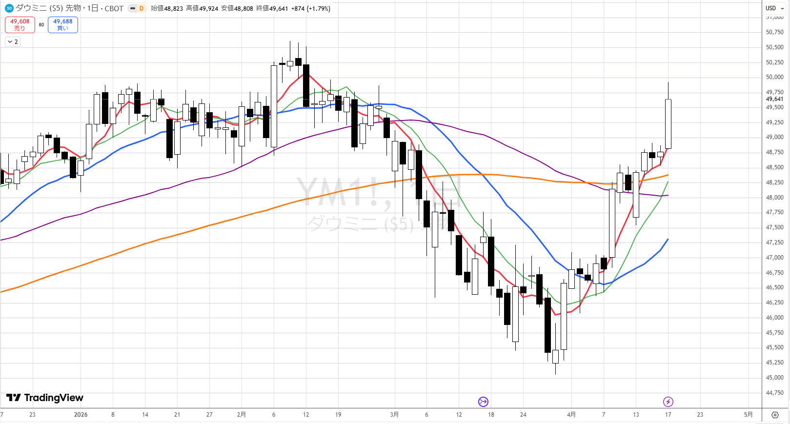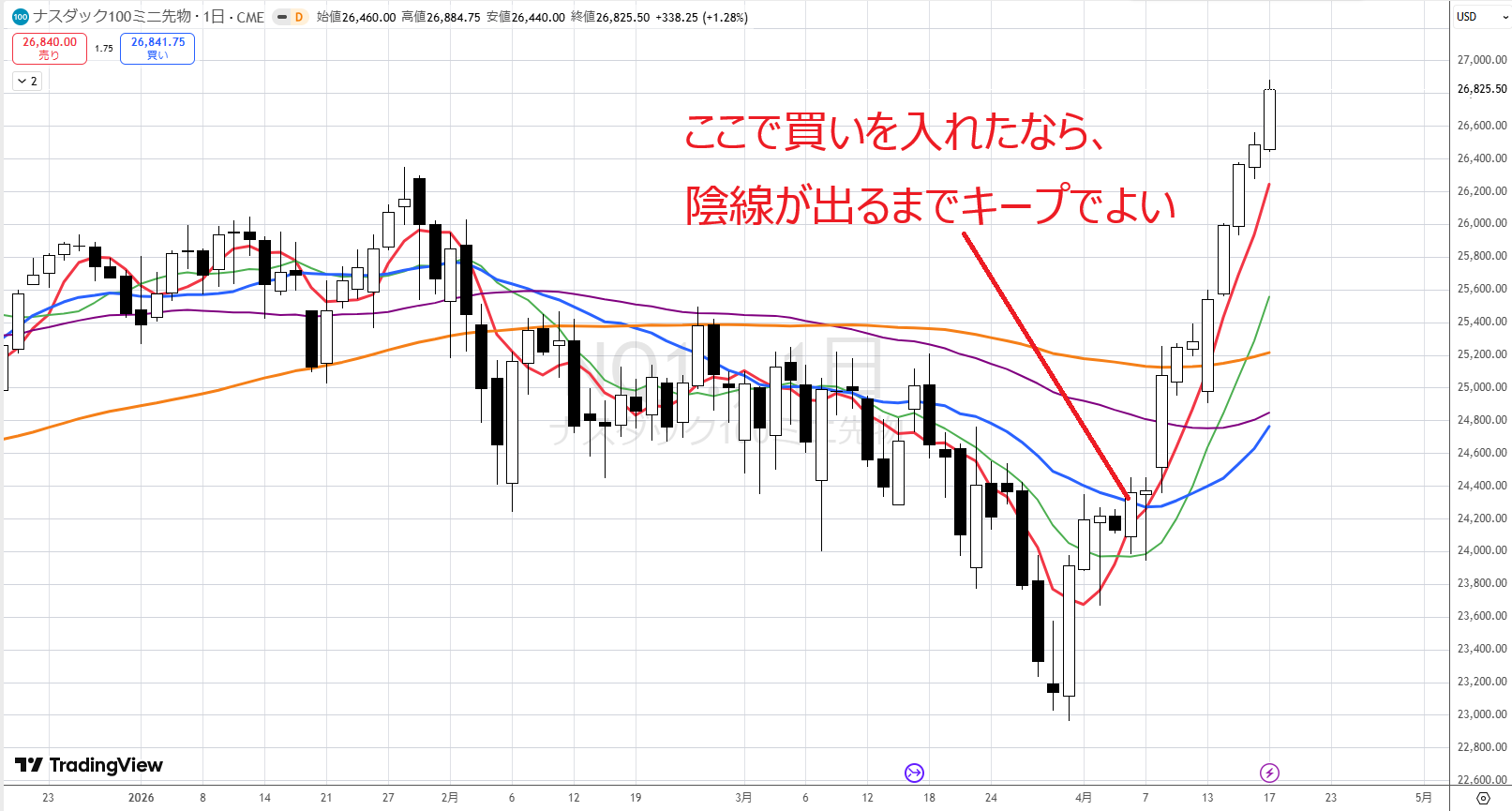 ナスダックは強いです。陰線の翌日に買いを入れた人は、根性が続く限り次の陰線が出るまで買いを持ってよいです。
