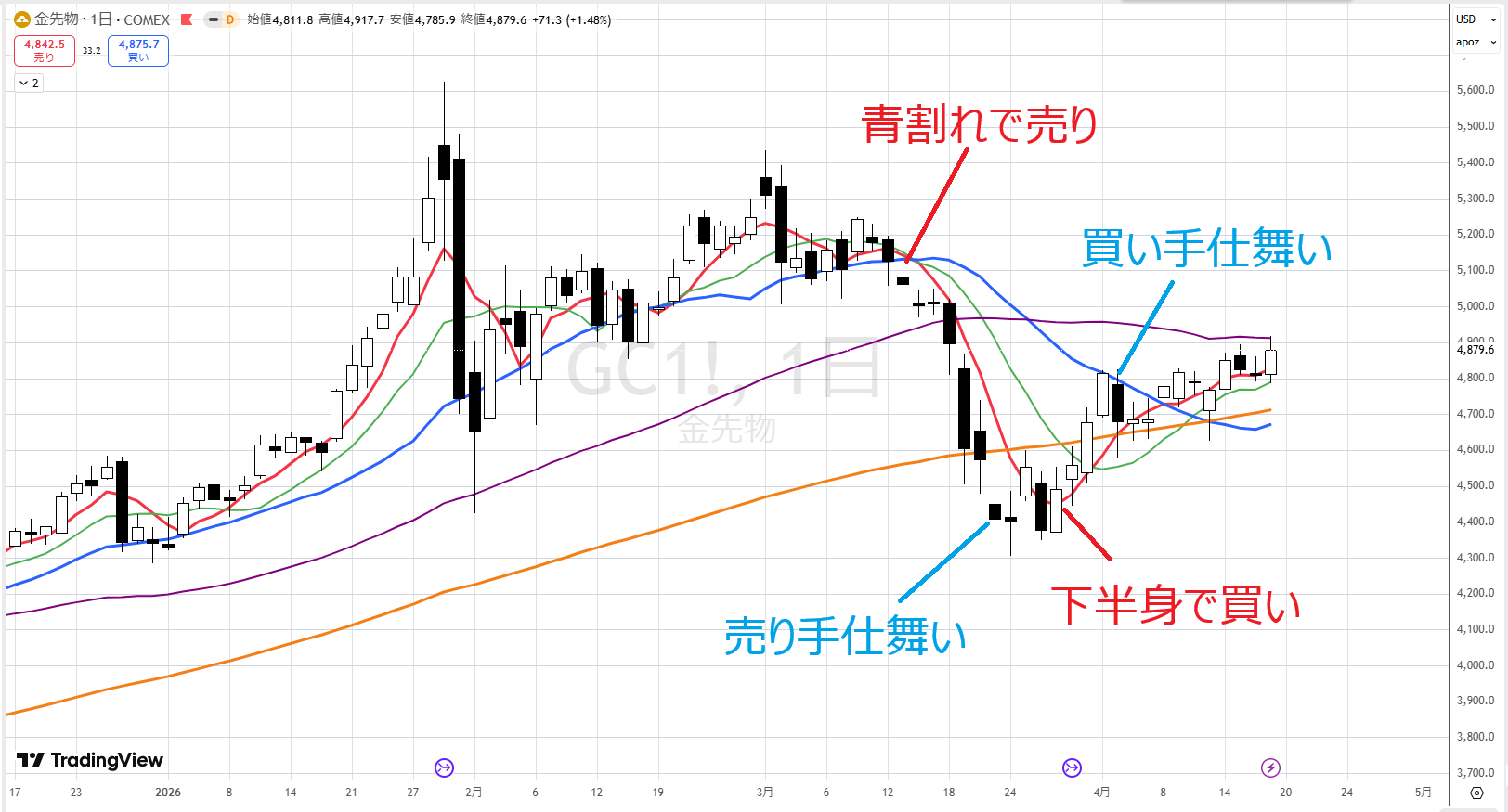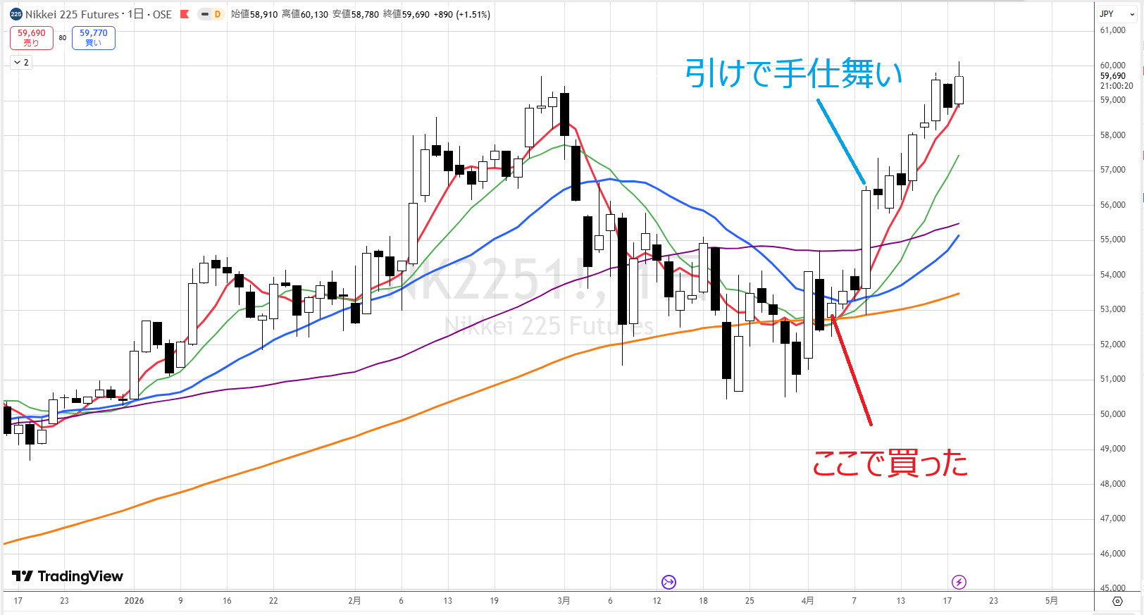 そのあと、4/16に陽線で赤の上に出ましたが、この時点での損益はプラスマイナスゼロになってるはずです。