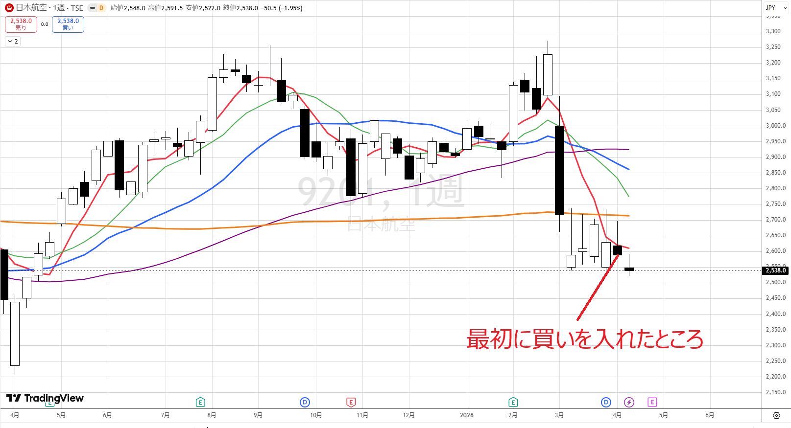 最初に買いを入れたところを週足で見ると、陰線でした。4週間同じ場所に株価がいるので、下げ止まった感じがします。