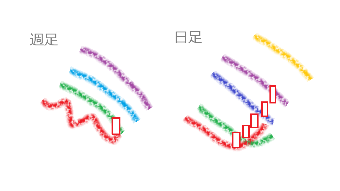 この場合、まず日足がちょっと下がってきます。月足と週足はまだ上がっている状態です。