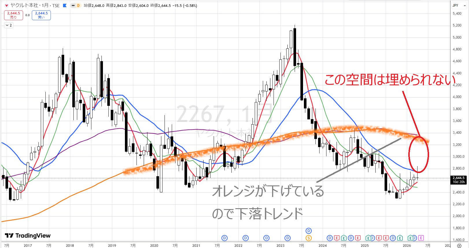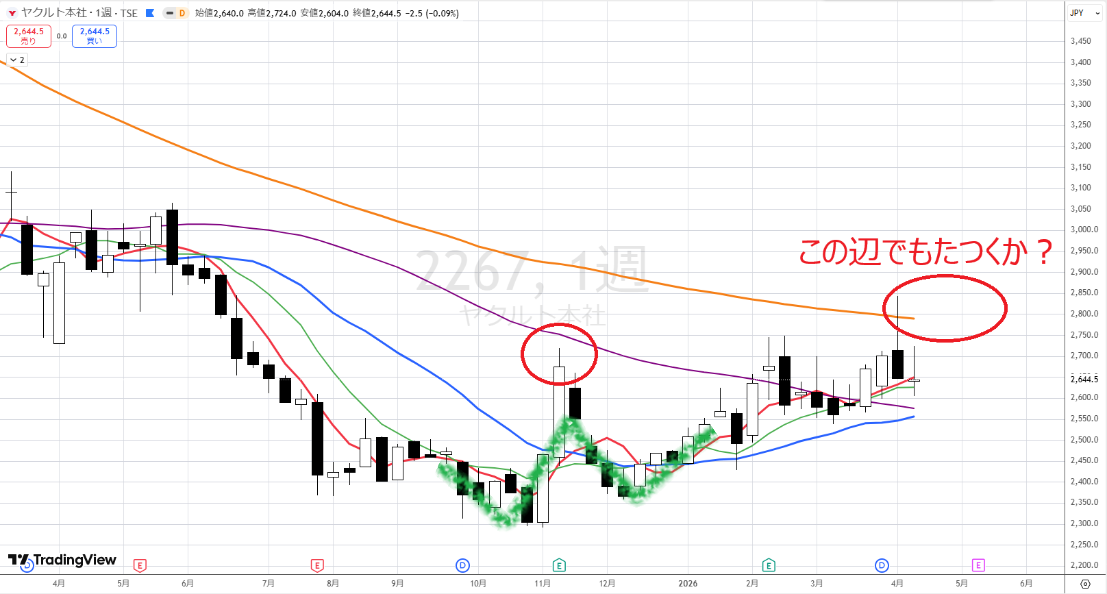 従って、ヤクルトの場合、週足オレンジ近辺でもたつくのではないかと考えられます。