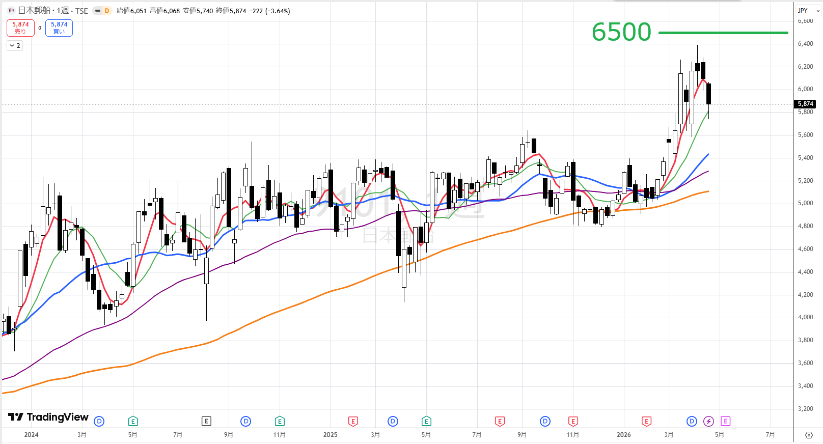 週足で見るとずっと上がってきましたが、6500円まで行かずに下げました。