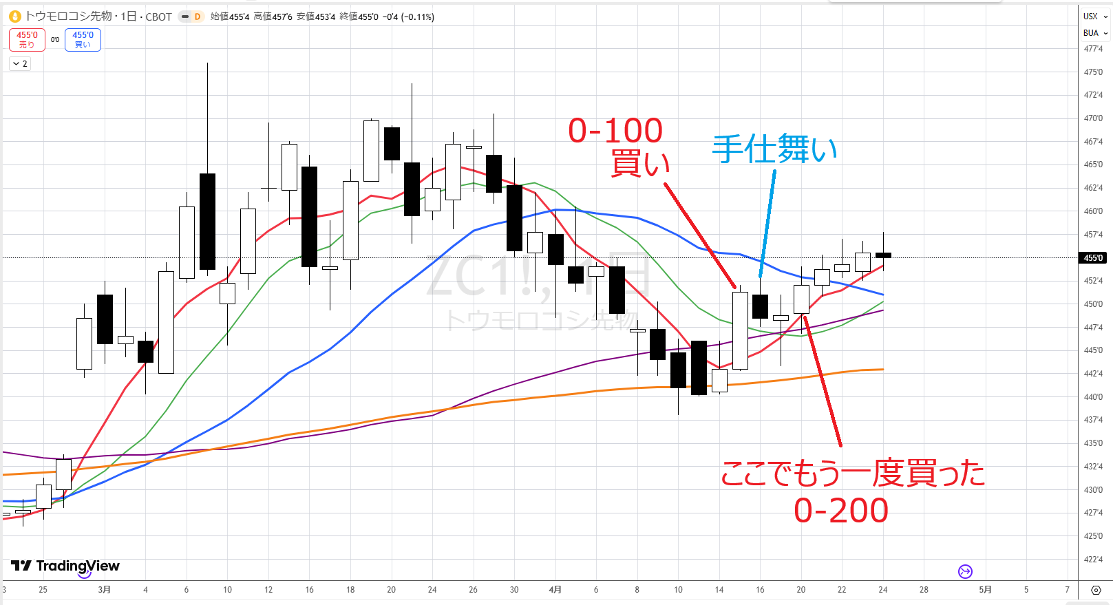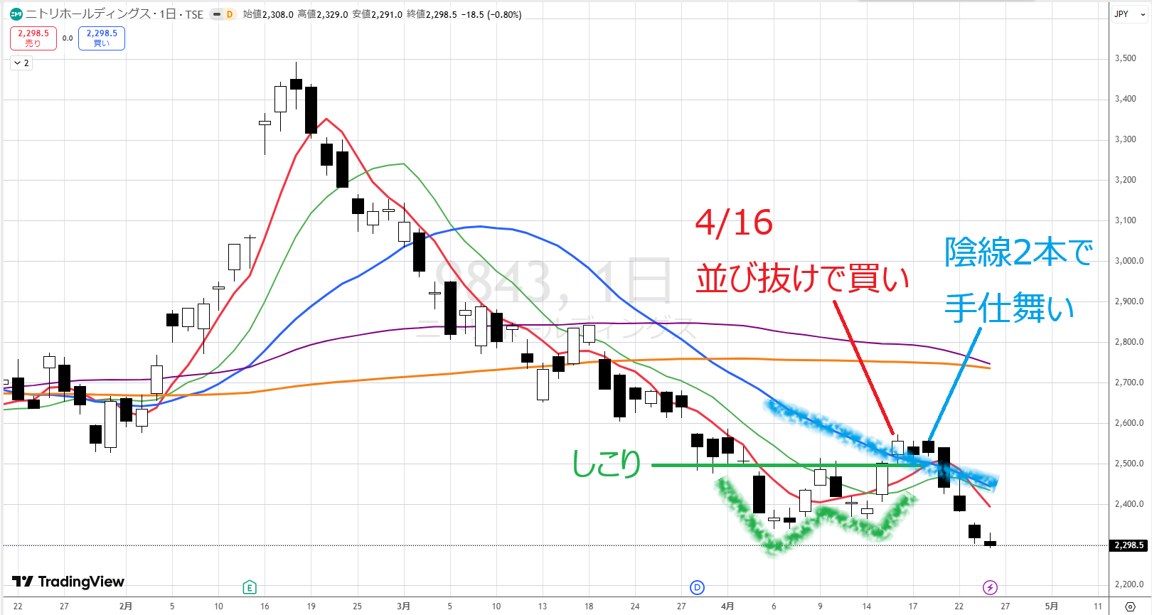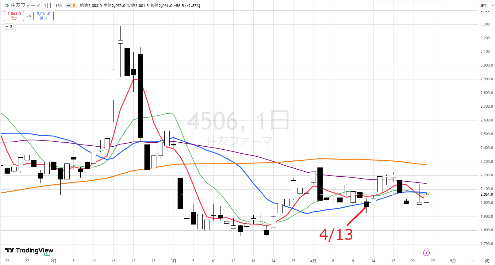 結論は、ここはまだ早いです。たとえば、並びを超えてきたので4/16に買ったとします。