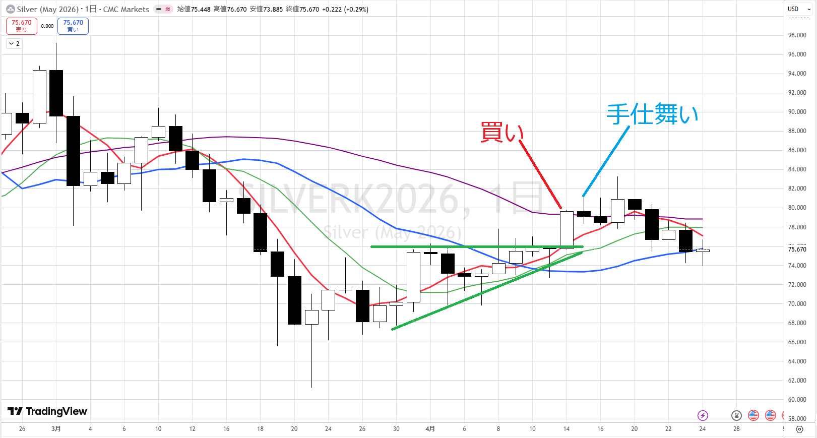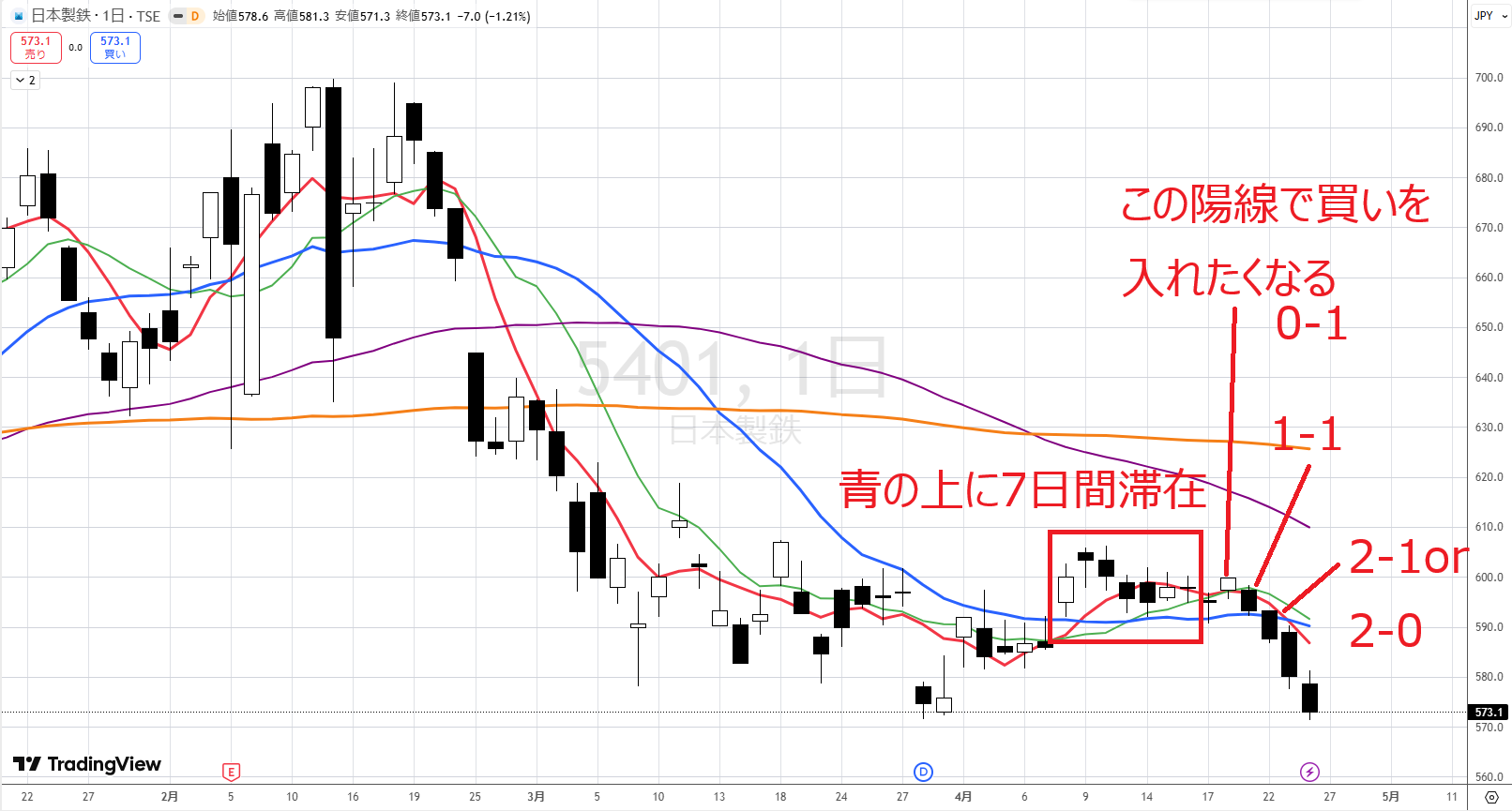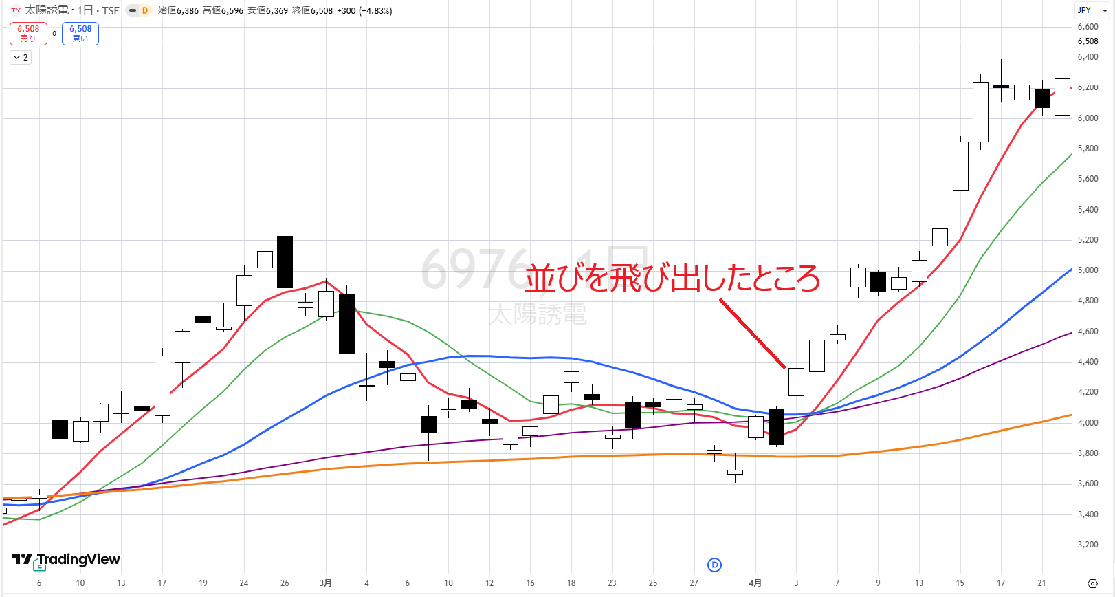 結論は、ここはまだ早いです。たとえば、並びを超えてきたので4/16に買ったとします。