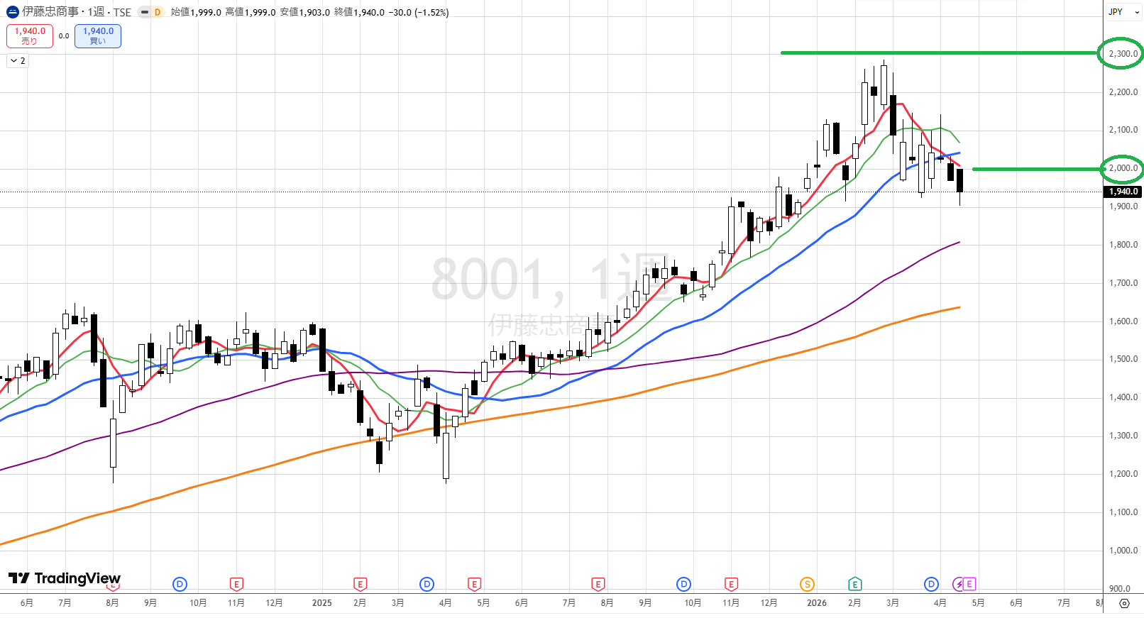 伊藤忠の週足では青を割っていますが、紫やオレンジまで一気に下げることはあまり考えられません。下げたとしても紫まで下げる途中で一度上げて、その上げが弱い場合は紫を割り込んで、オレンジまで下げることが考えられます。