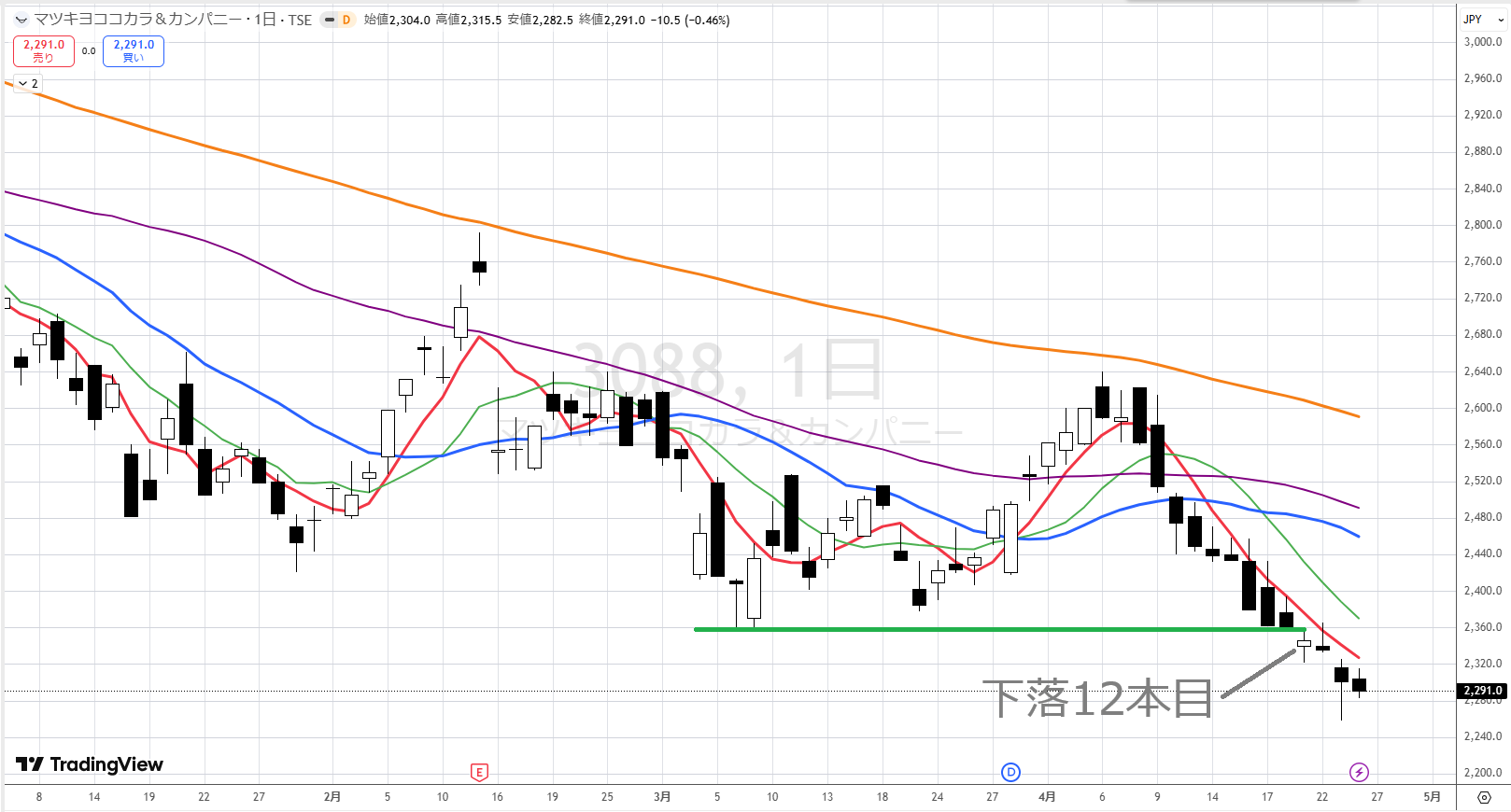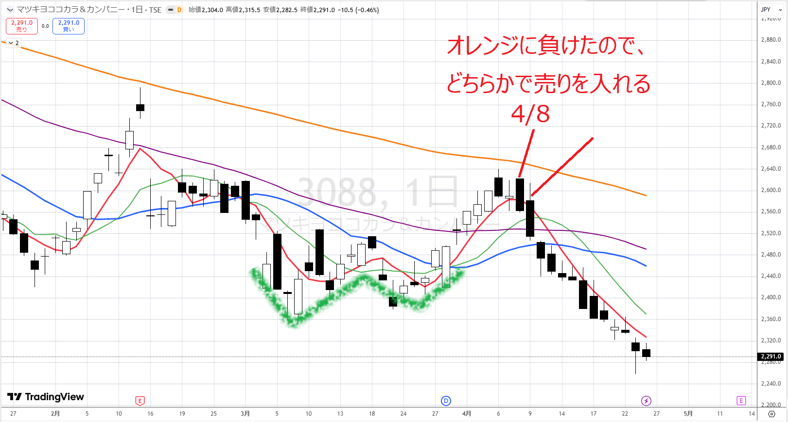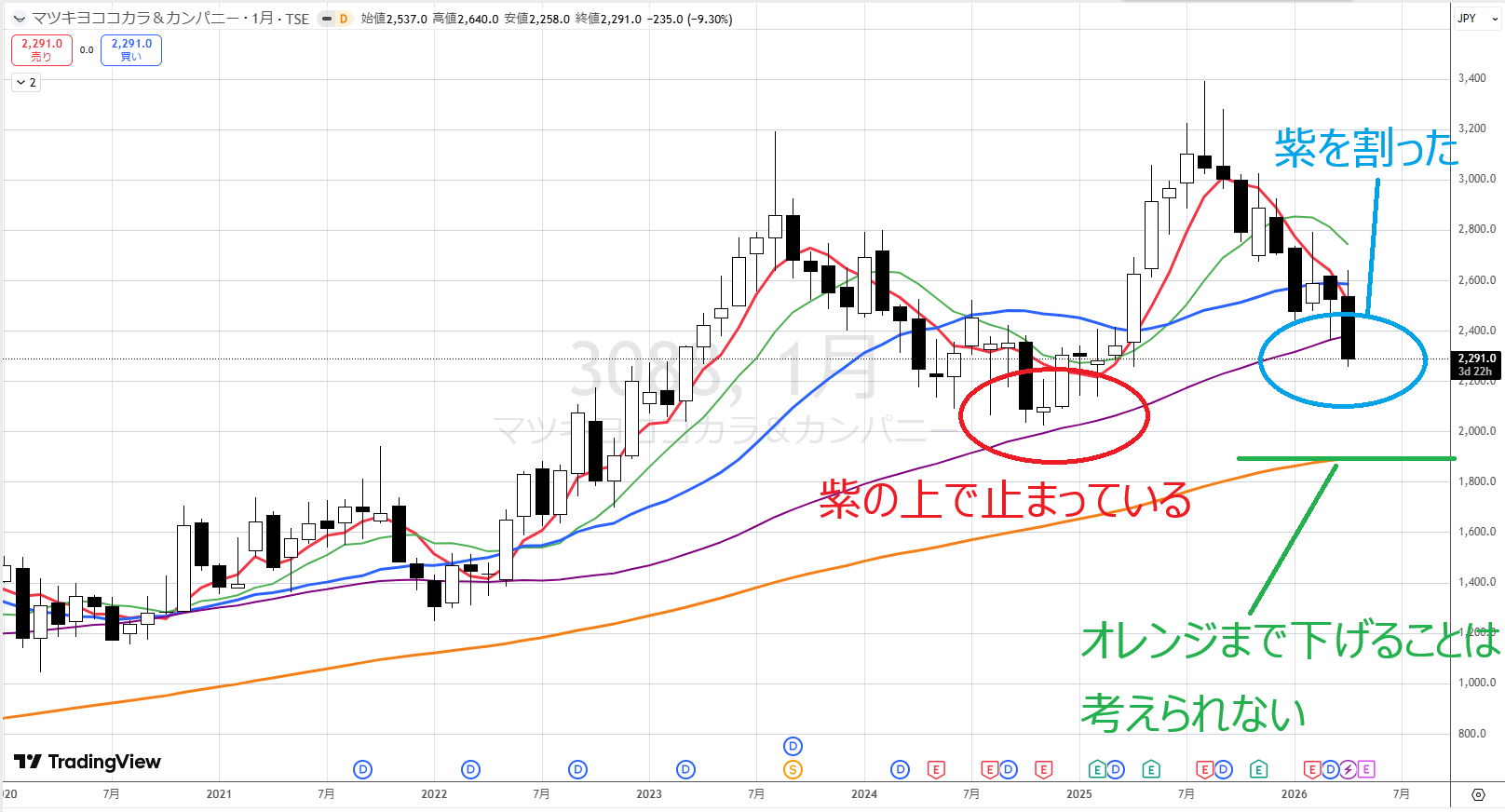 マツキヨは上からオレンジが下がってきて、下に紫と青があるので、下落トレンドなんです。