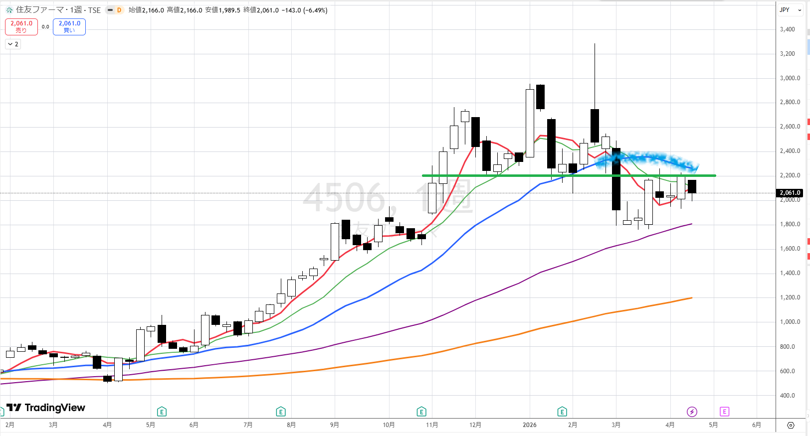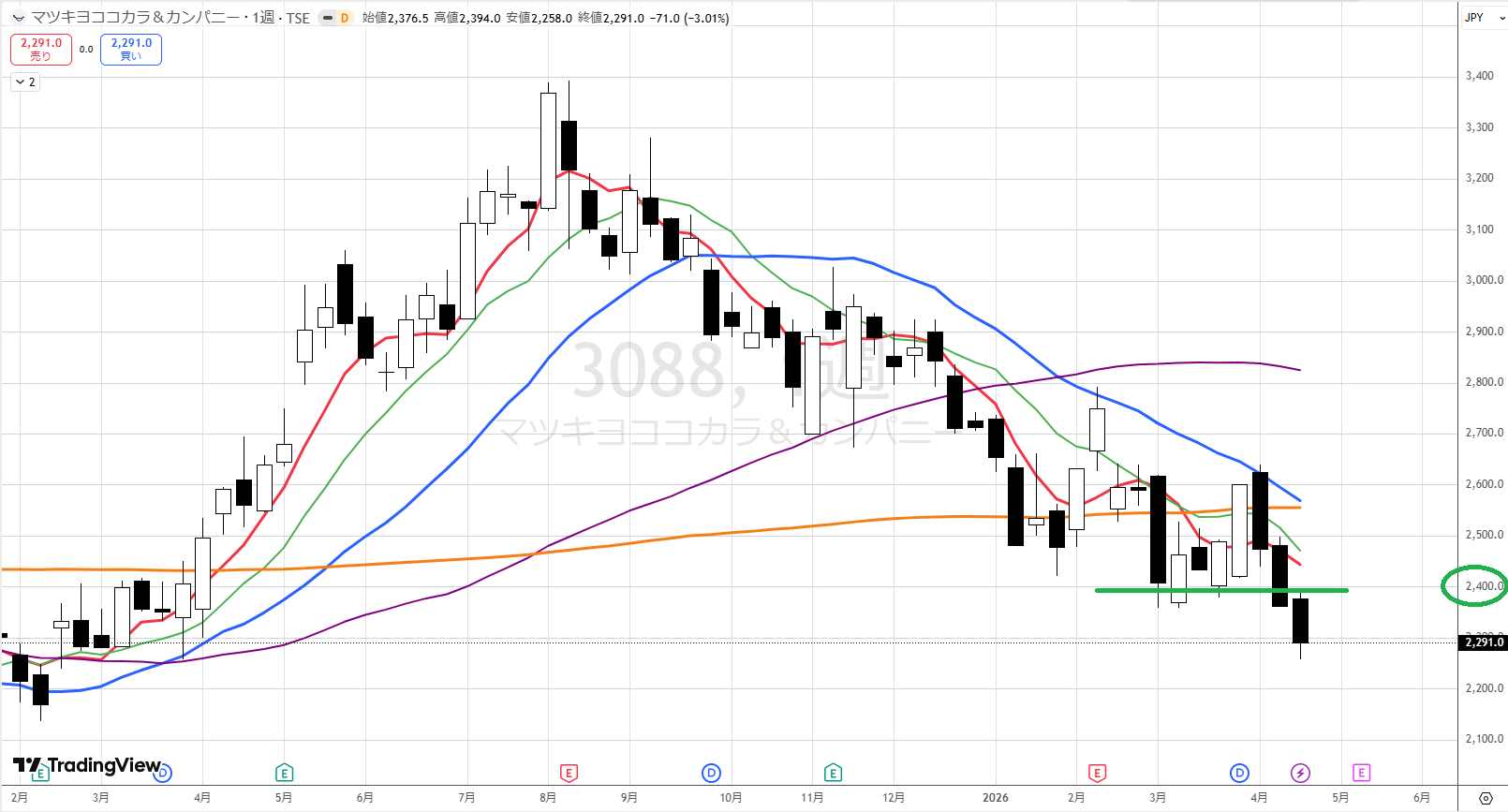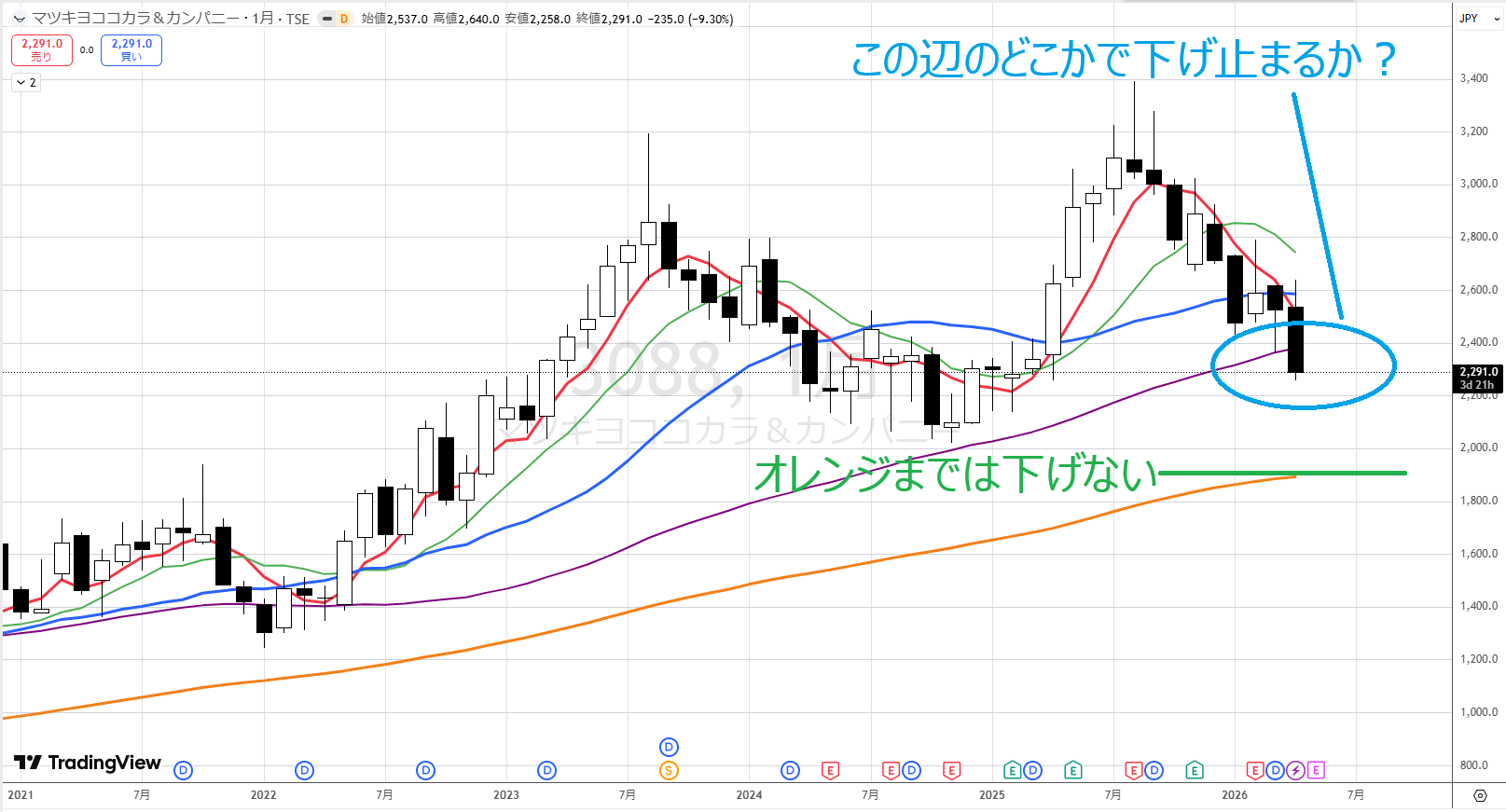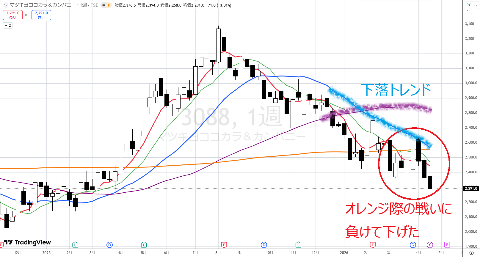 さて、これからどうなるか?週足を見ます。オレンジ際の戦い負けて、この並び(2400円辺り)を割ってますので、基本、弱いです。