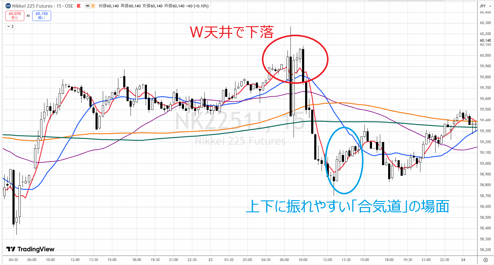 日経先物の15分足チャートを見ます。