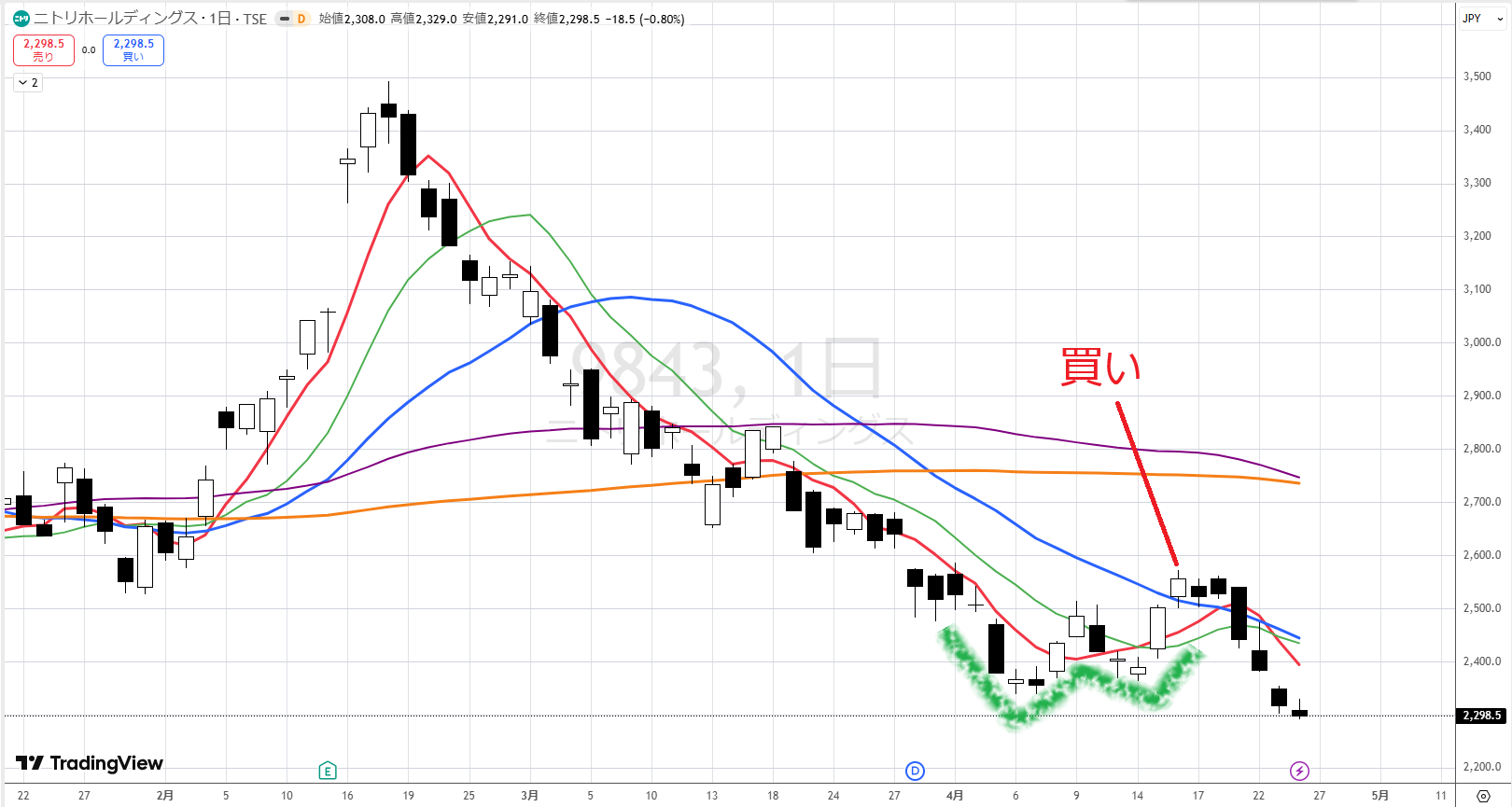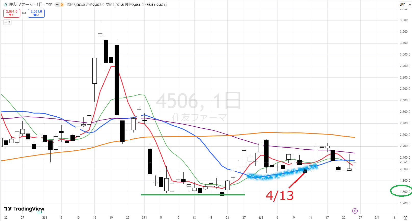 なぜかというと、青が上を向いているから、ちょっとややこしいです。しかも、下値がここです(1800円辺り)。