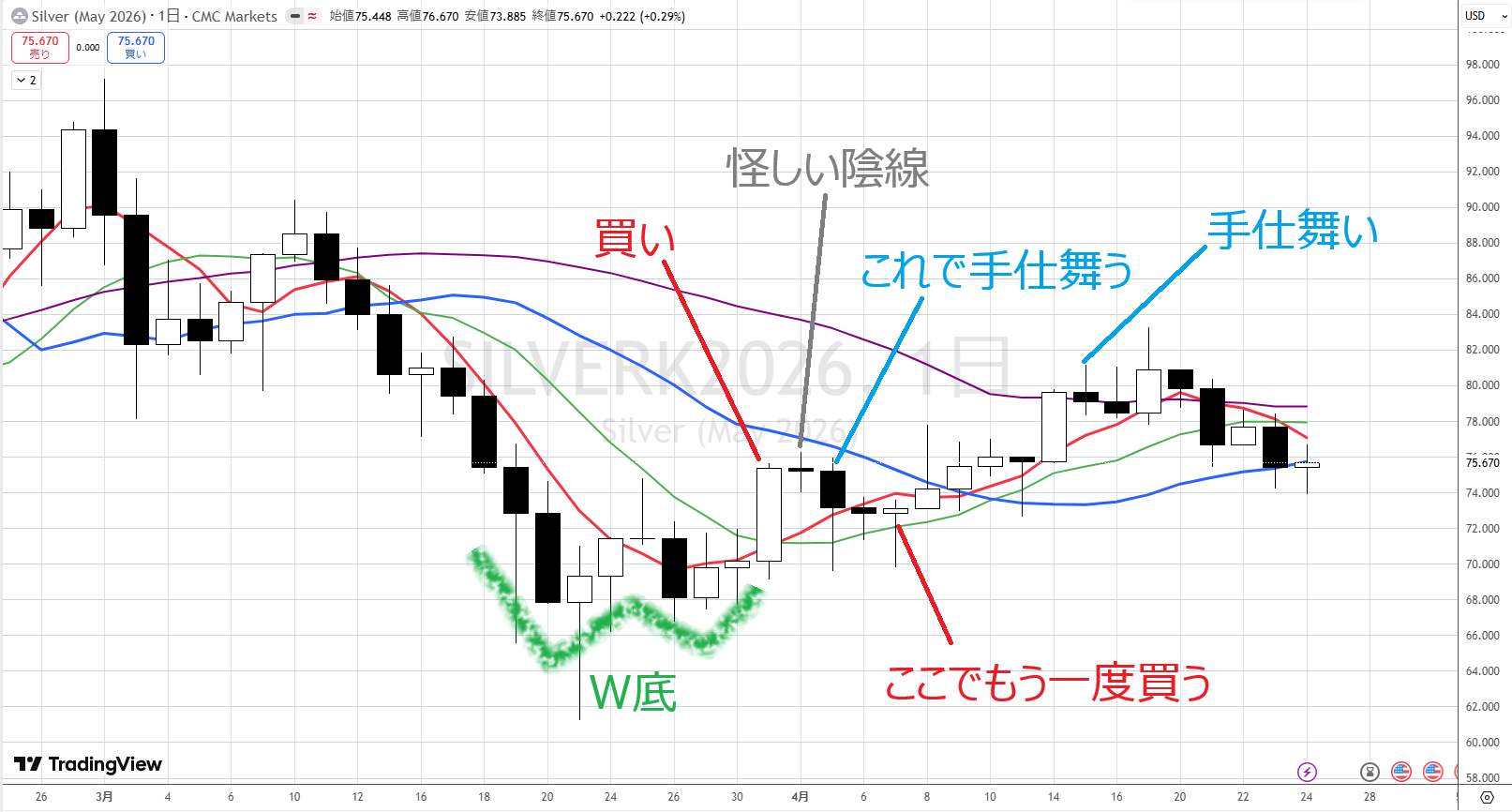 4/20に陽線下半身なので買ってみようと思うけど、青が横ばってますのでボックスの可能性があります。ここで買う場合は、買った後にすぐに陰線が出ると思って買わないといけません。