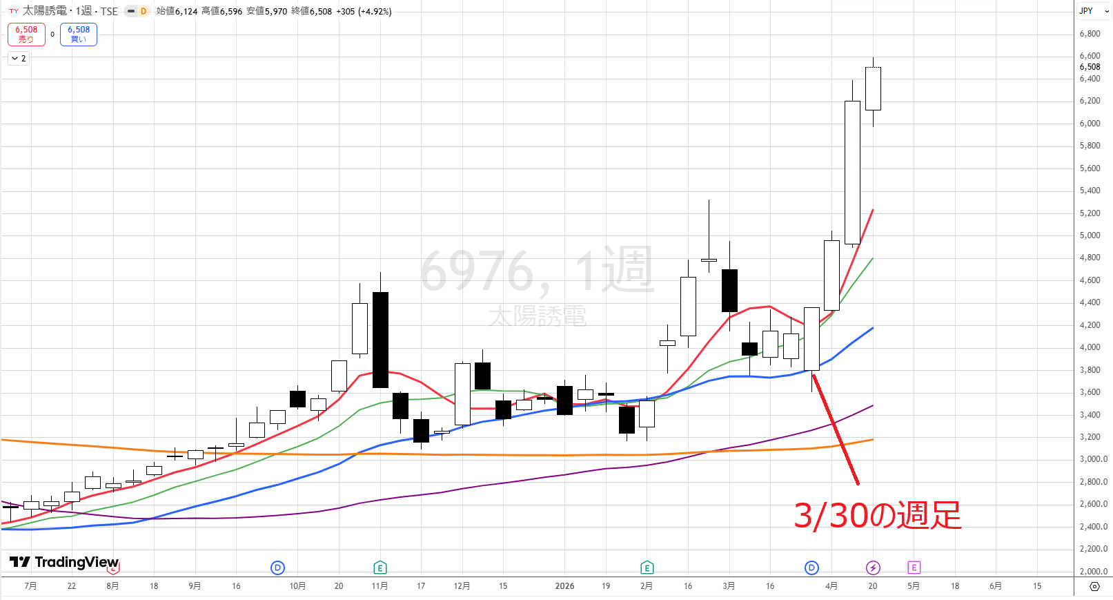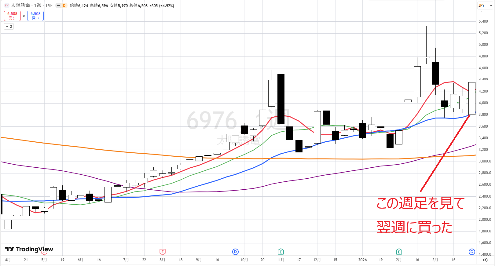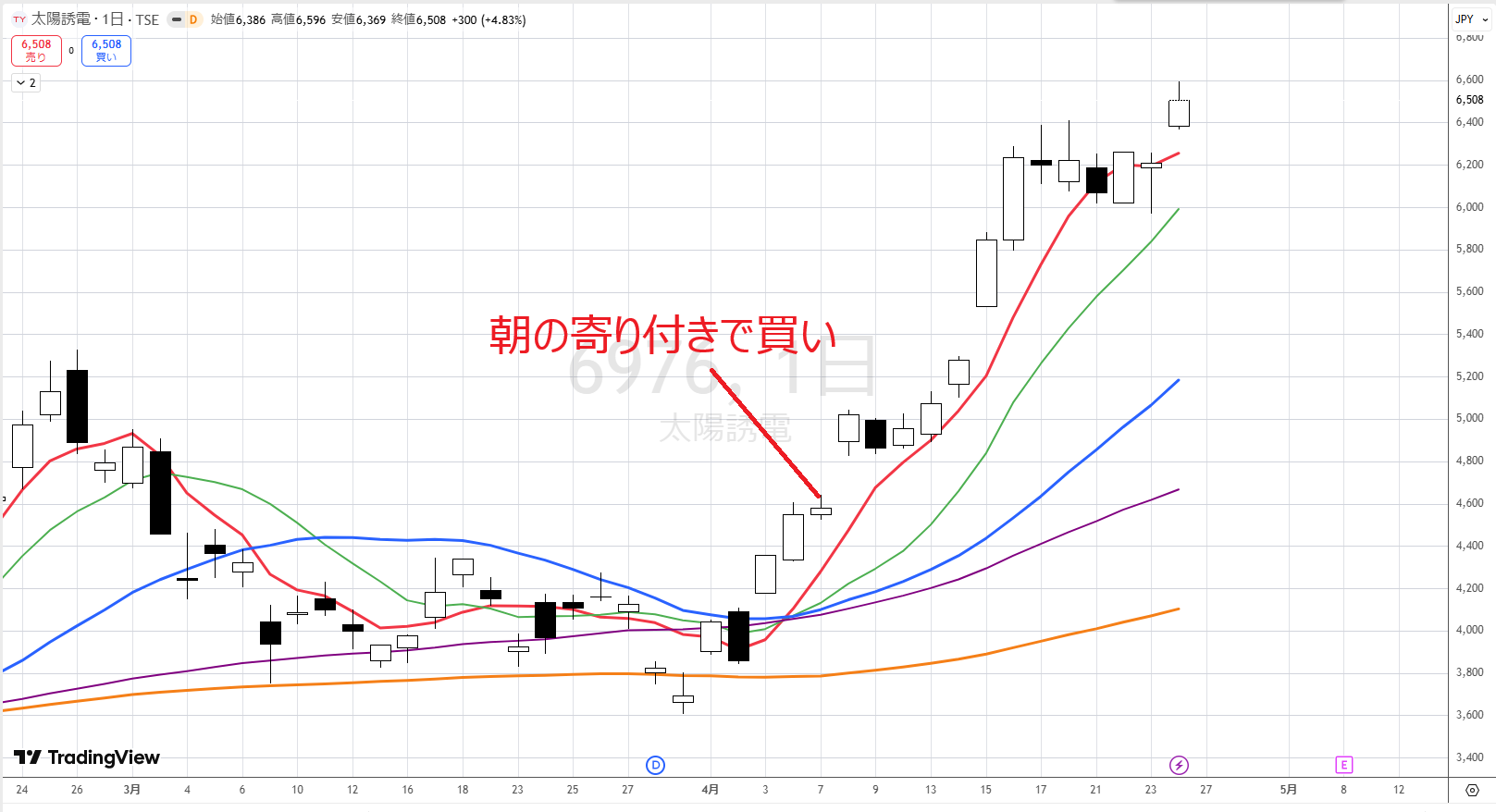 3/30の週足を見て狙いを定め、翌週の4/7の寄り付きで買いエントリーしたところ、ぐんぐん上昇し、まだ保有中です。途中で追加できなかったことが課題です。