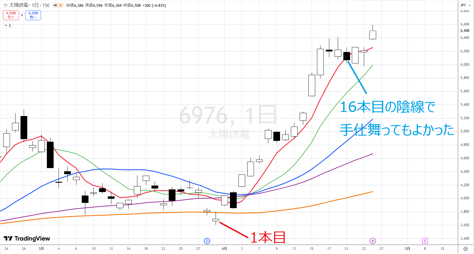 6876太陽誘電の手仕舞いは本数と陰線が続いた場合でしょうか?週足、月足ではまだ行きそうに見えますが、どのように対応すればよろしいでしょうか?