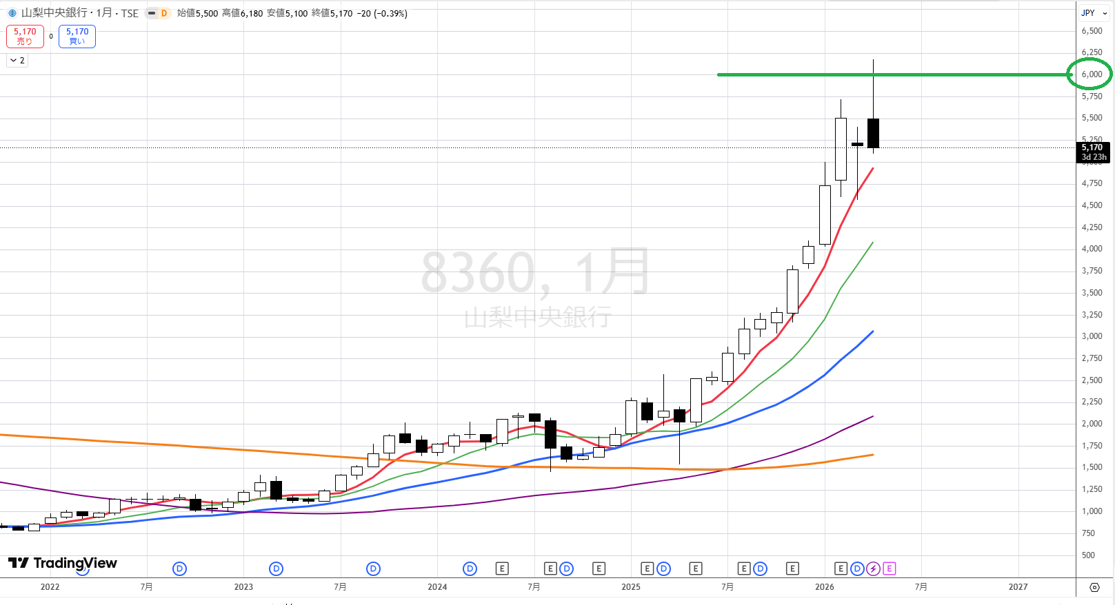 月足で見ると上ヒゲ陰線になっています。5000円を超えて、6000円をちょっと超えたところで、6000円を節目として下落しています。