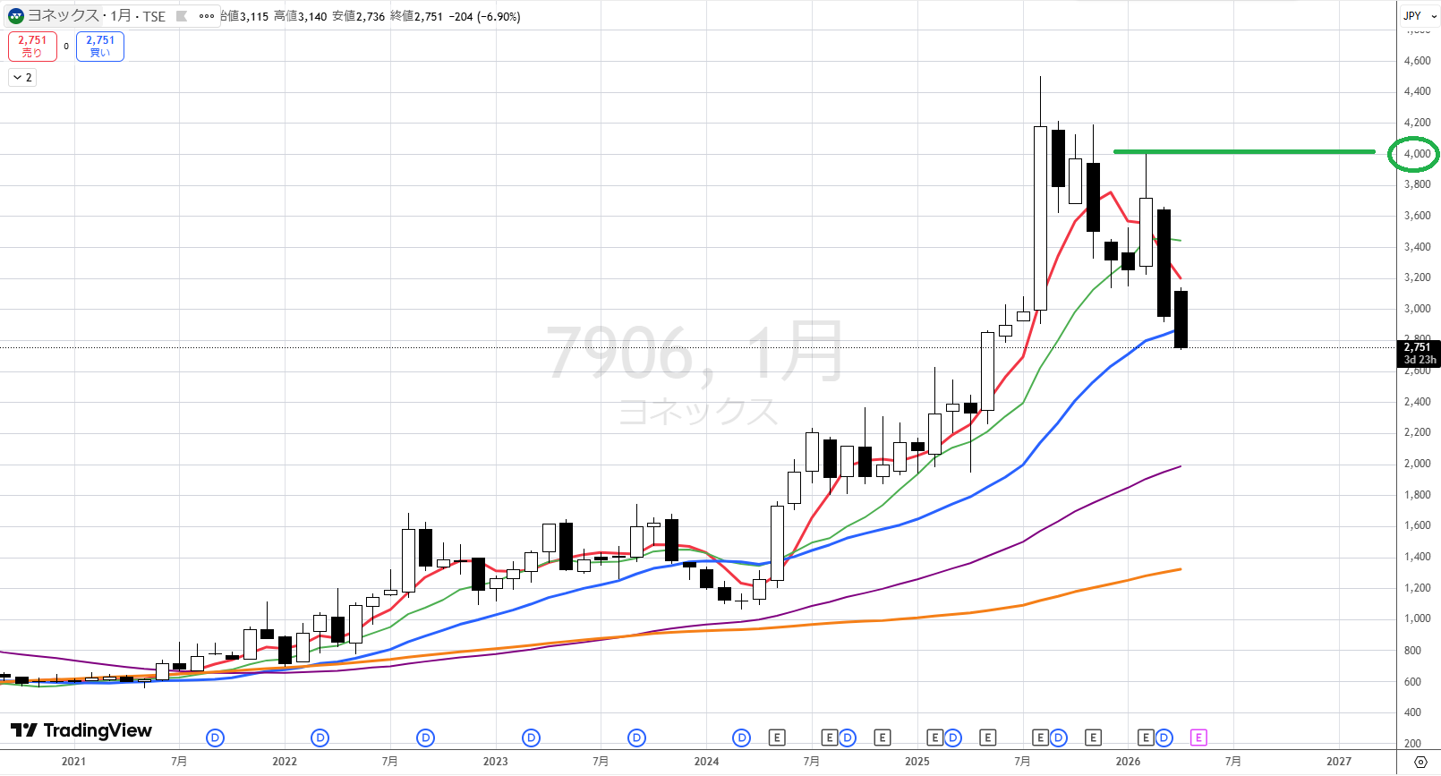 ただし、相場流の見方では、紫(50か月線)まで下げることは考えにくいです。2200円辺りに節目もあります。