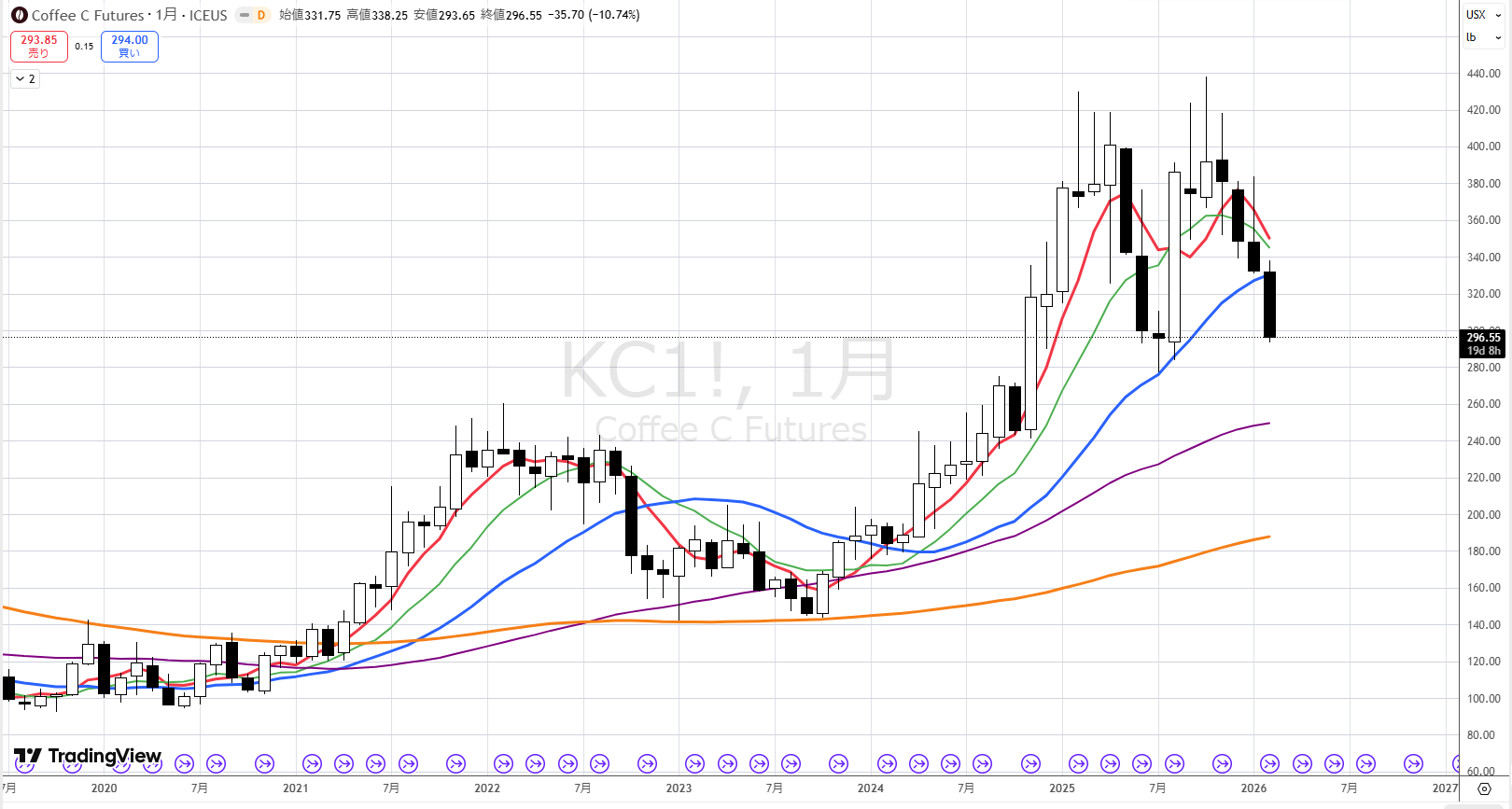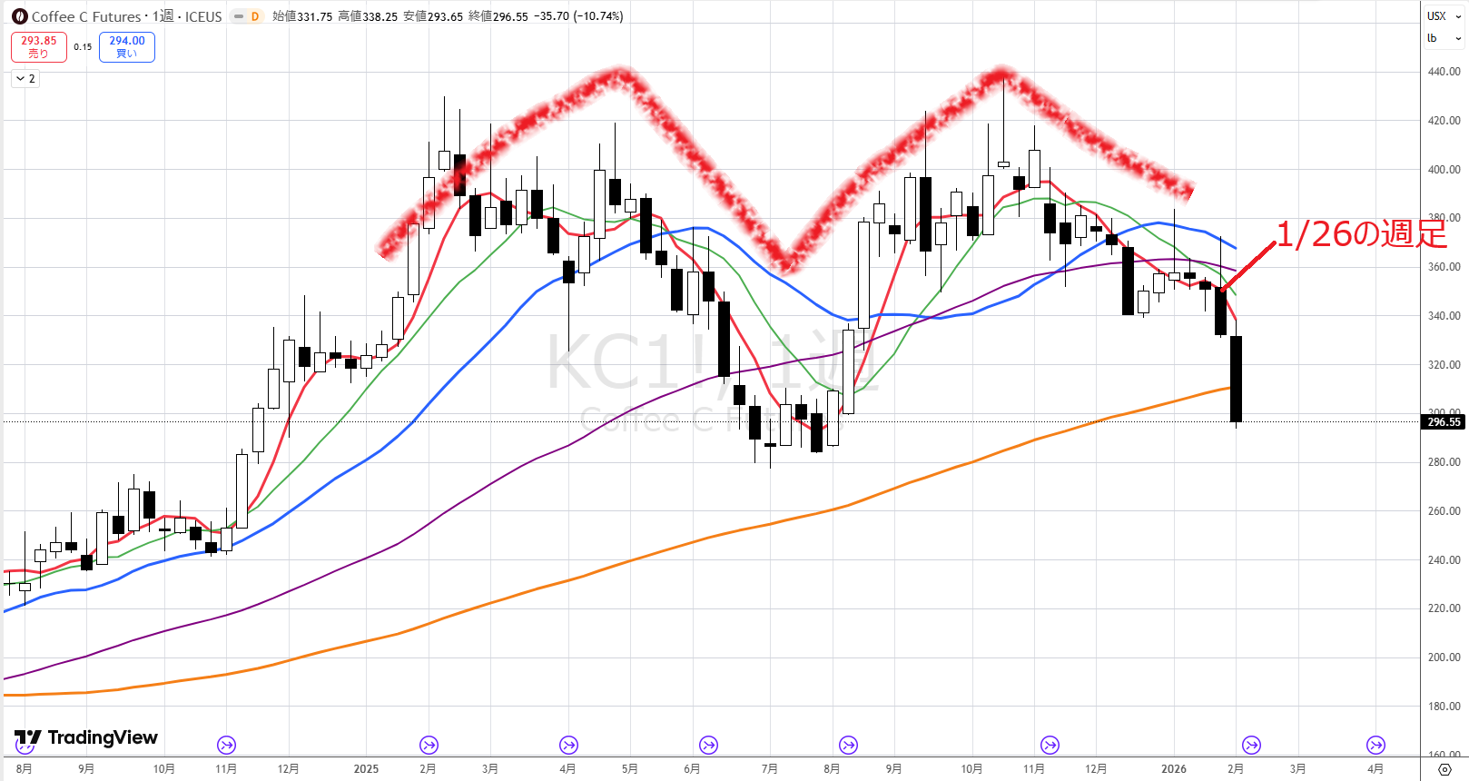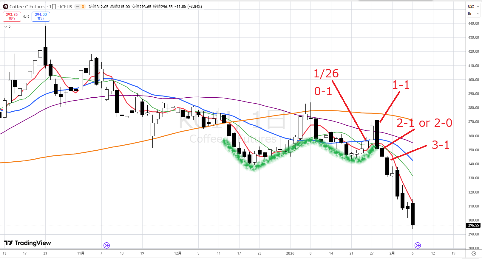 コーヒーですが、1/26の陽線を見てW底になると思い、翌日寄り付きで買いを入れました。大きく上昇して喜んでいたら、その翌日に大きな陰線が出てしまいました。ここはスクエアがいいでしょうか?