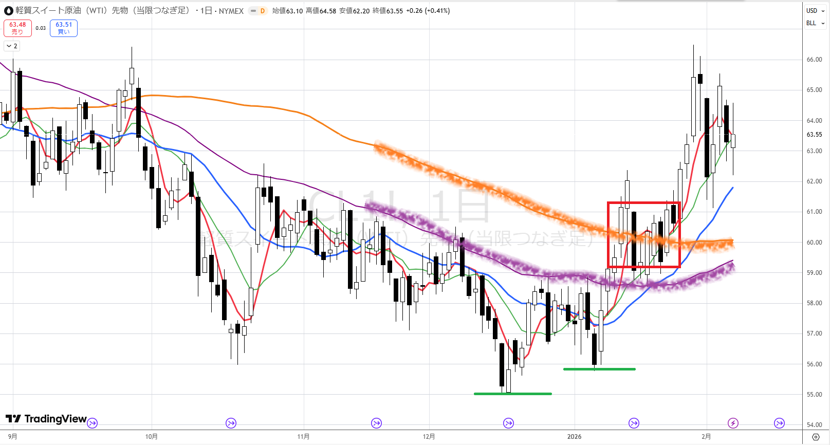 その理由は、離れていたオレンジと紫が徐々に近づいており、下げてきた紫が上を向き始めたからです。