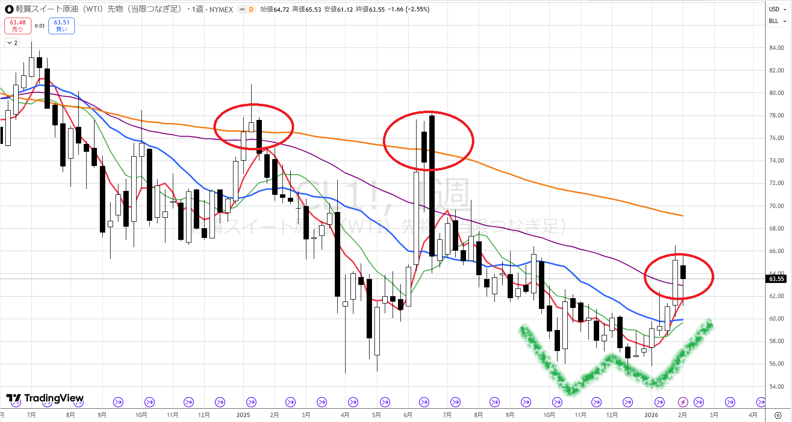 原油は週足レベルでW底をつけて一気に上がっていきました。
