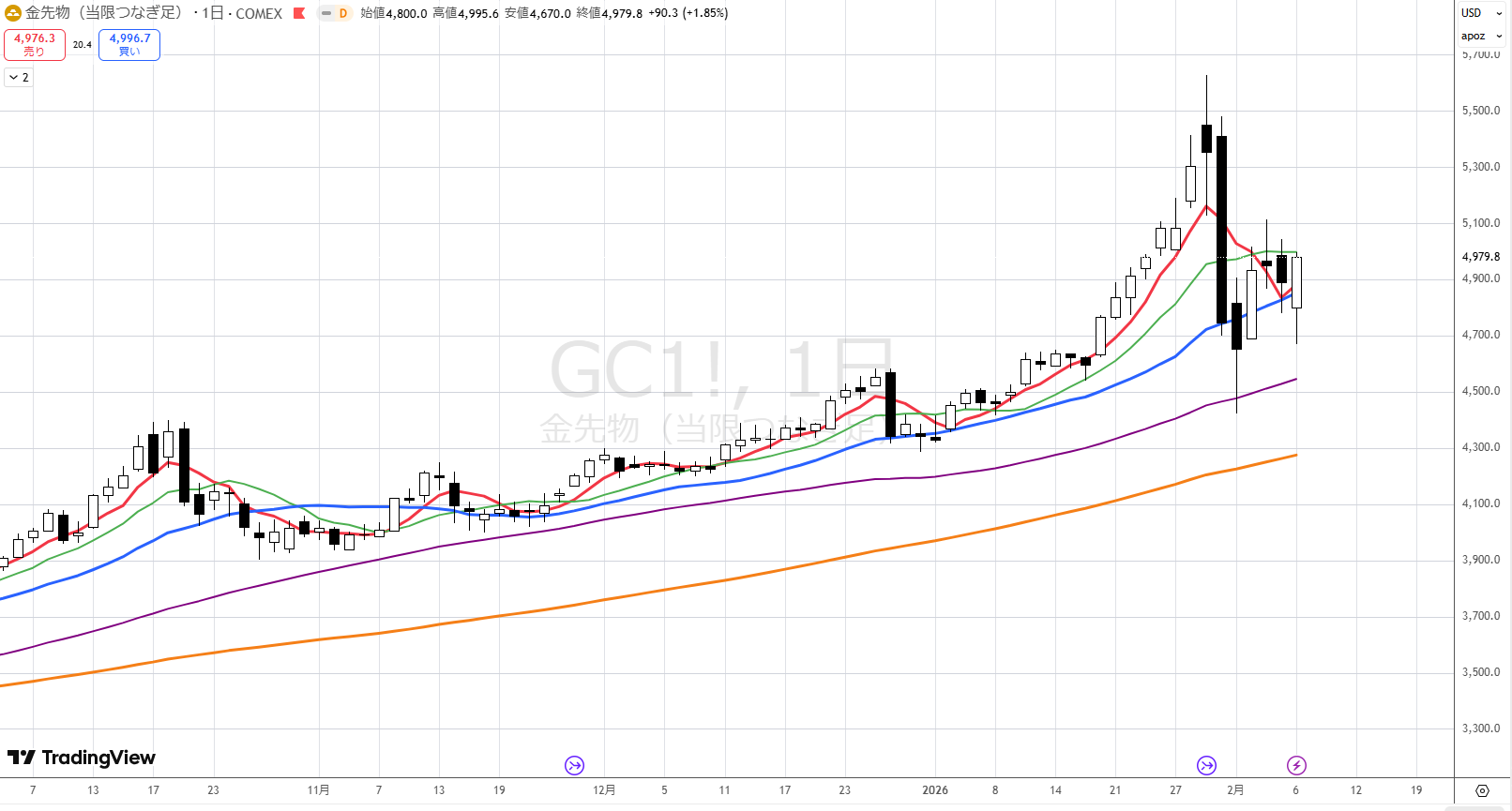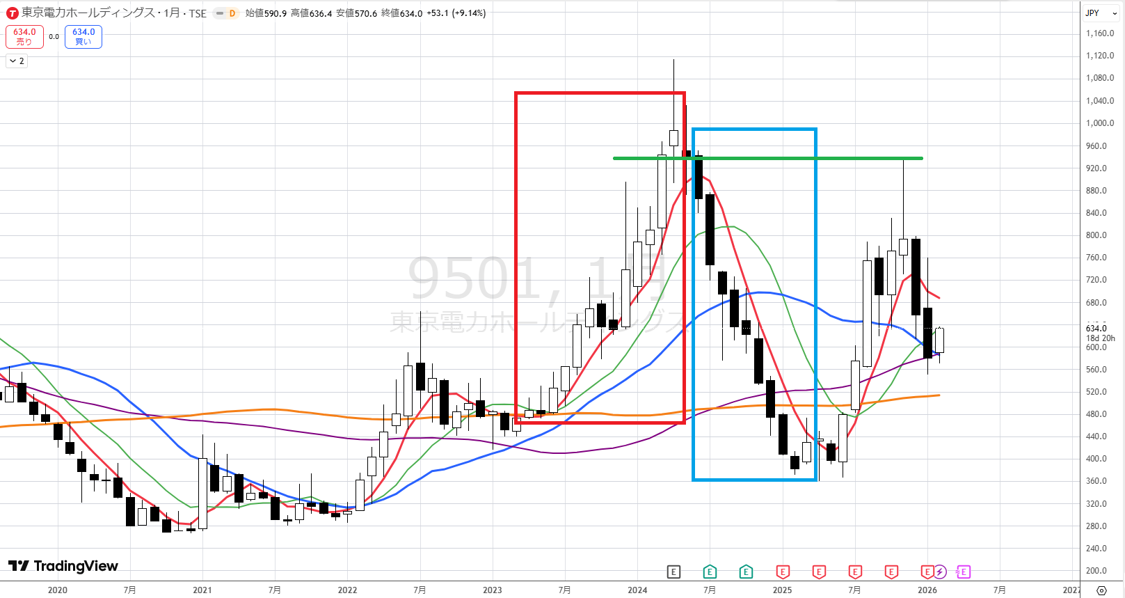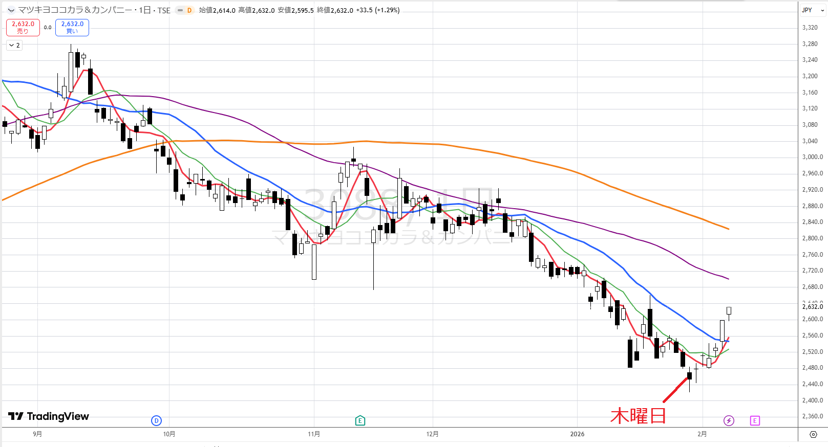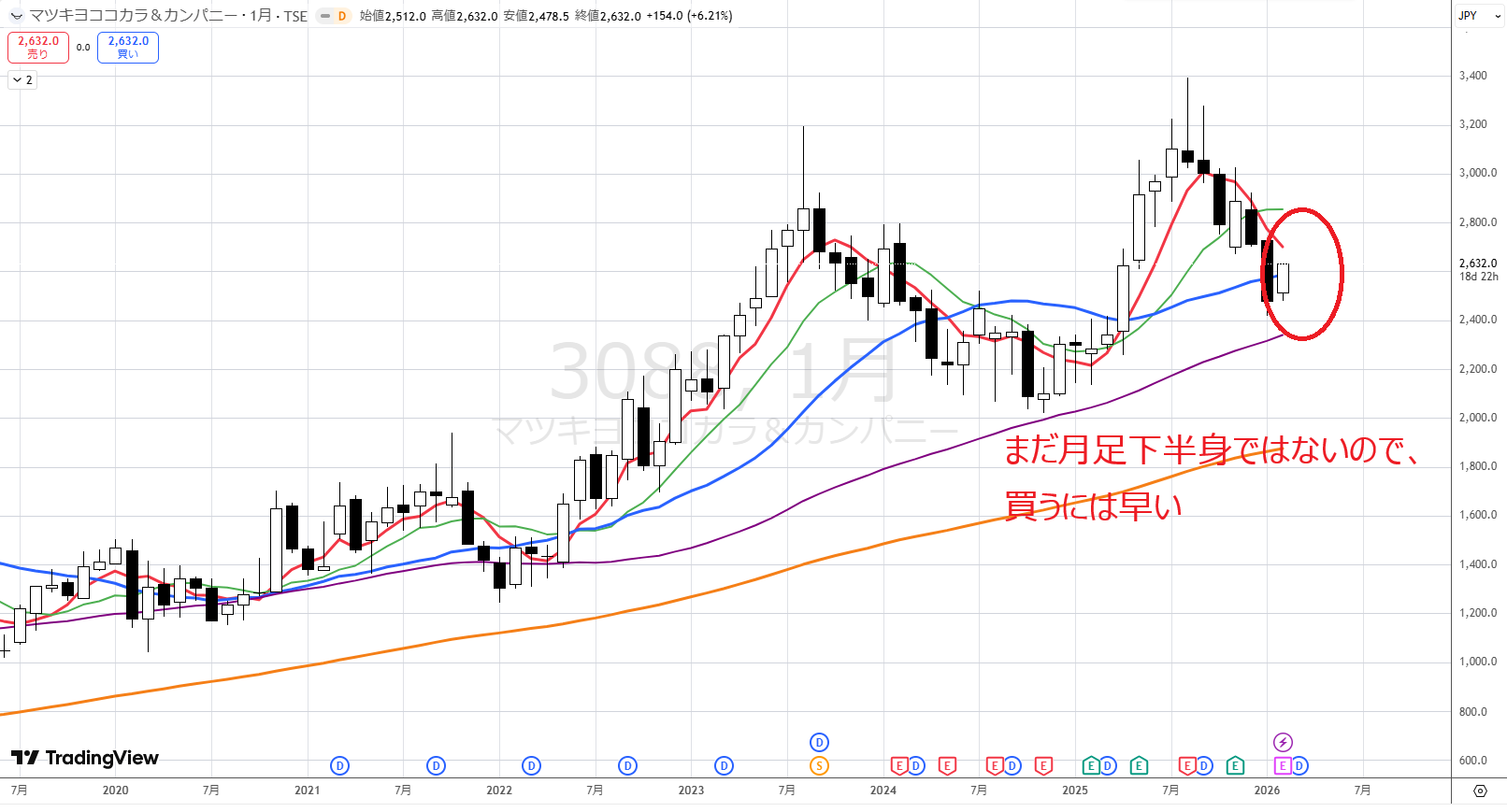月足ではここ6か月間の底値が固まってきています。今月は青に近づいており、徐々に青を超えようとしているように見えます。