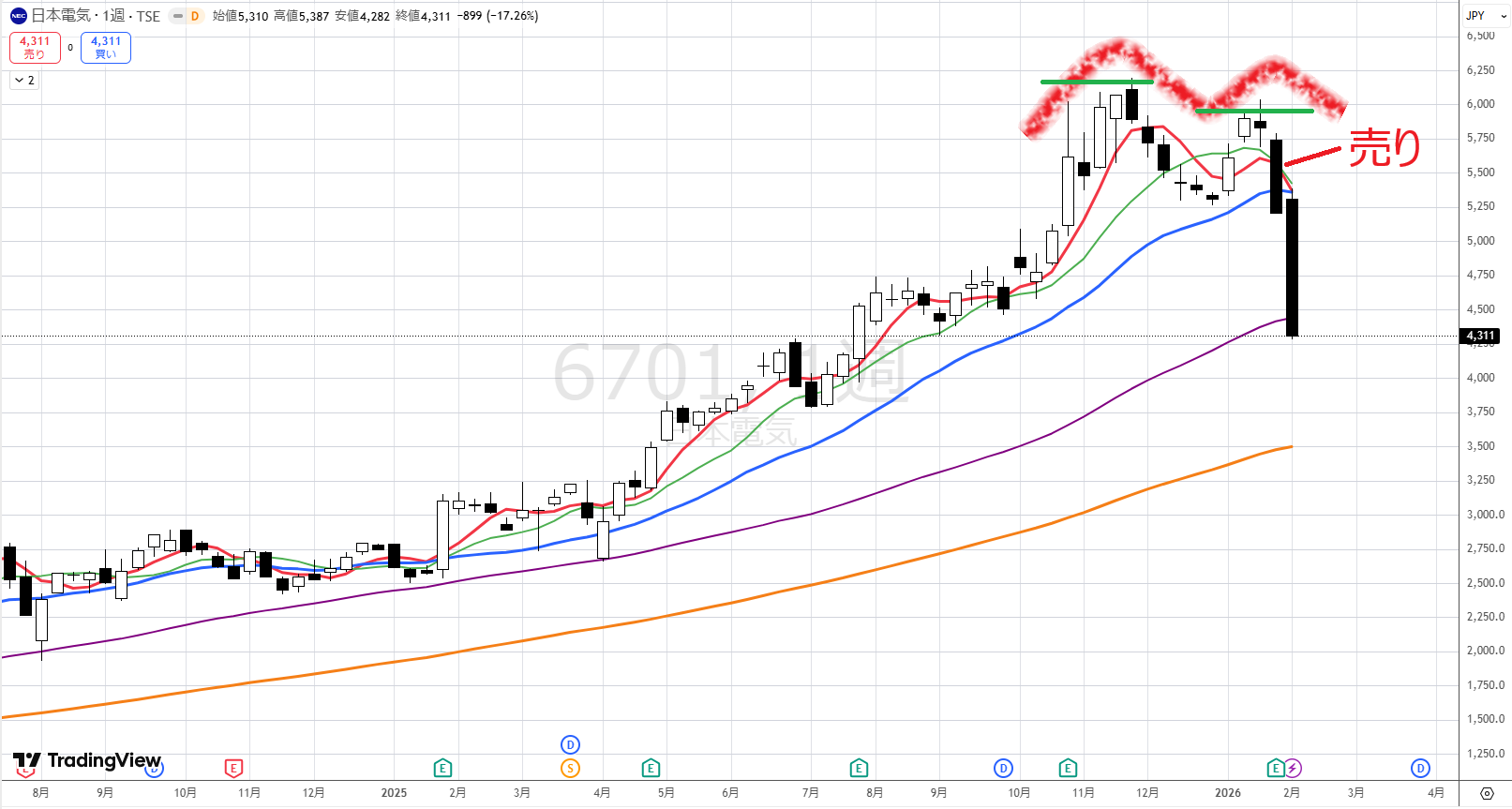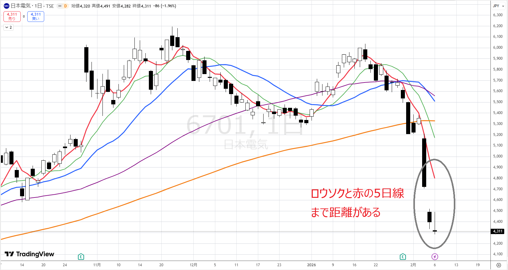 (赤まで距離があるので)NECが下半身になるためには、大暴騰しないといけません。今は4397円ですが、5日移動平均線は4981円にあります。