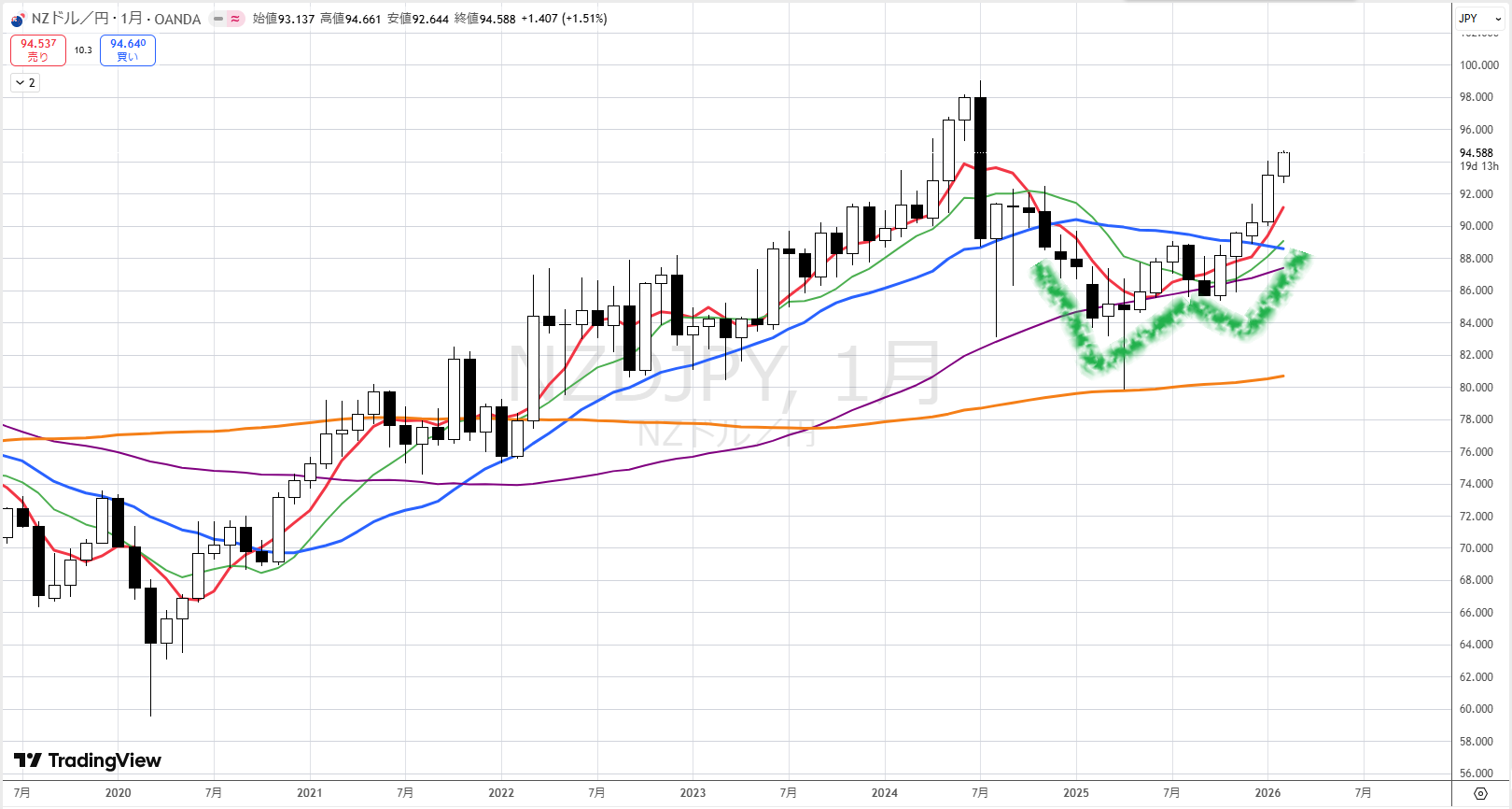 現在は紫まで上がっています。過去にオレンジまで上がっていったところを見ると、このあとオレンジまで上がっていくのではないかと考えられます。