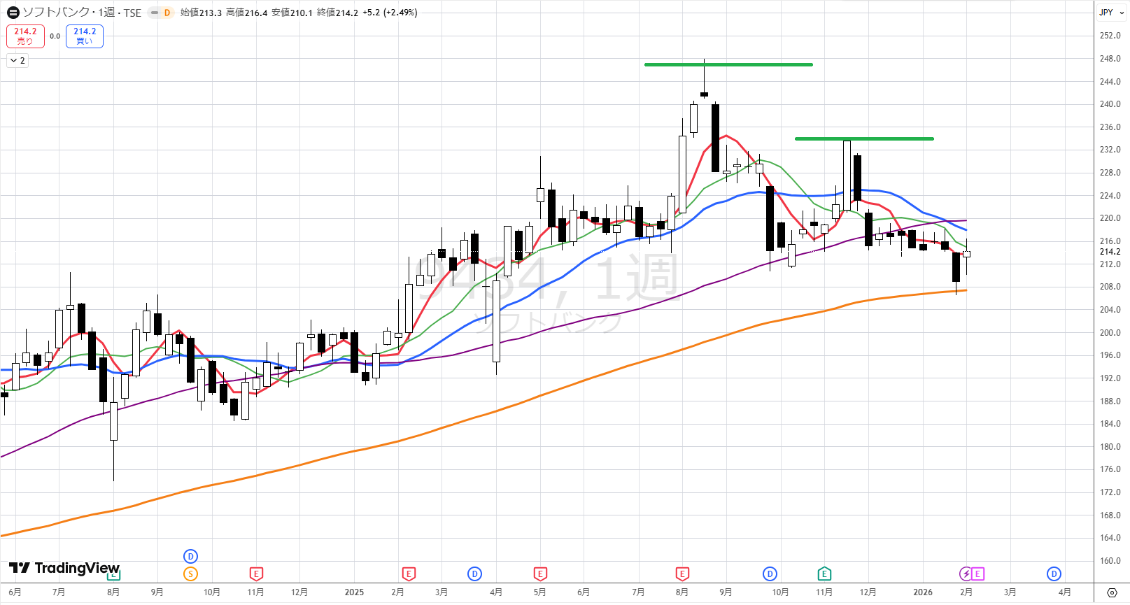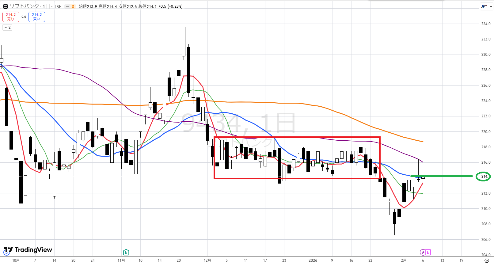 このパターンですが、オレンジの下に紫と青があって、ボックスをつくって一度下げて、次の上げがこの辺(213円辺り)で下げると、結構大きく下げる可能性があります。