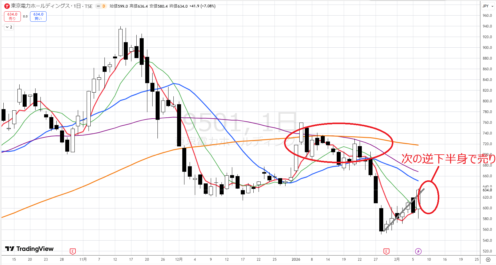 つまり、あと500円上げないと下半身になりません。それまでは上げられないので、もっと下がるか、1週間から10日ほど横ばってから上がるかのどちらかになります。
