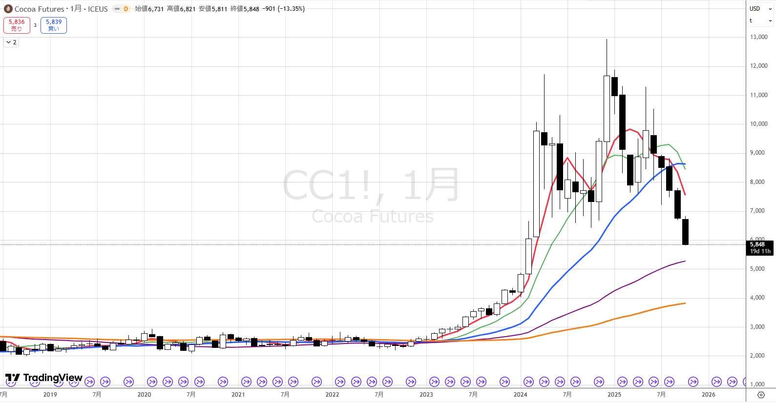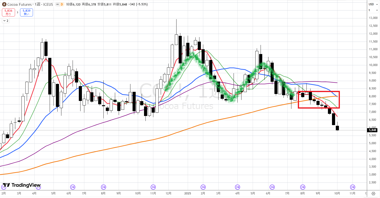 ココアは、これだけ下げていると日足では判断が難しいので週足を見ます。