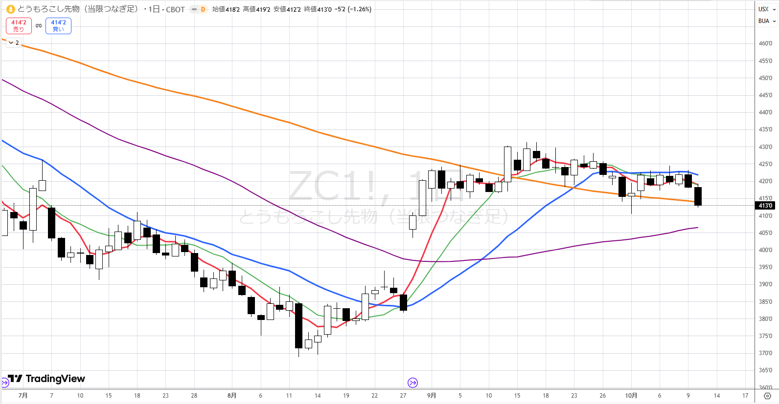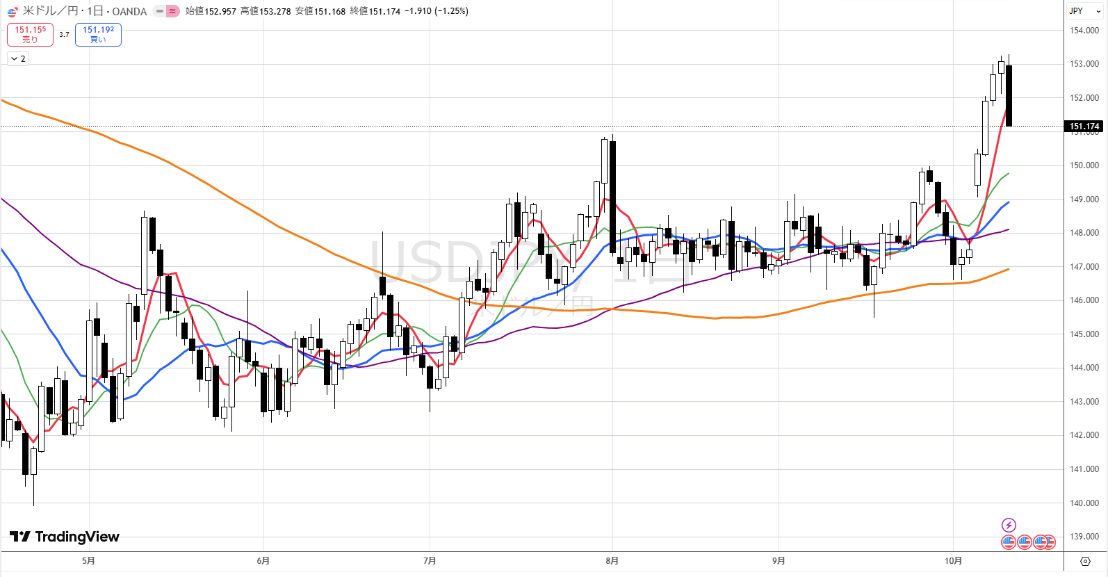移動平均線の順番は下からオレンジ、紫、青、緑、赤なので、株価がオレンジまで下げることは考えられません。上向きの緑か青、あるいはその間で反発すると思われます。