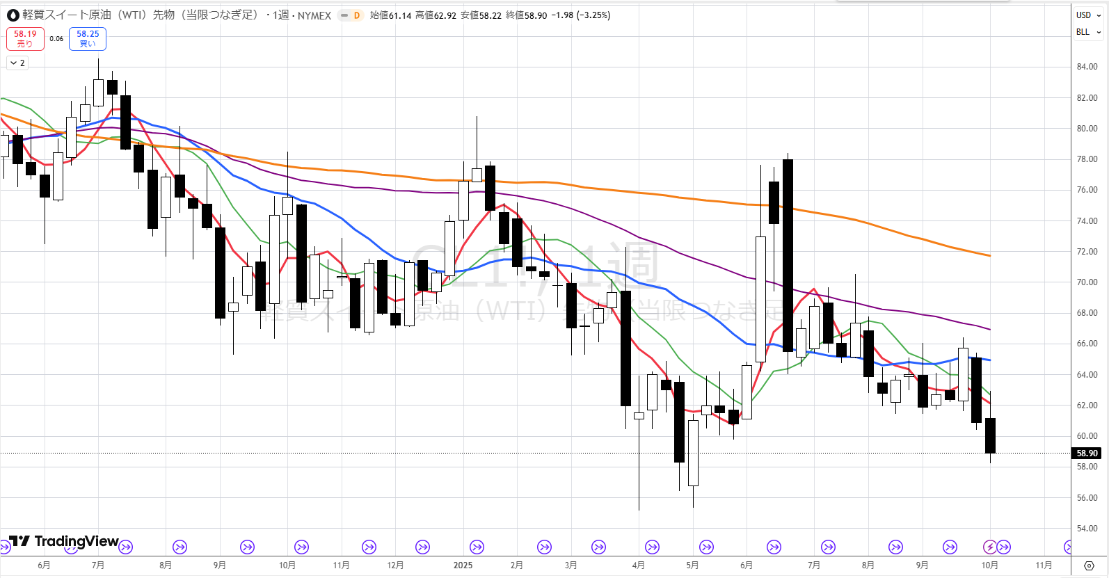週足W天井のオレンジ際割れです。青が間もなくオレンジを割りますので、これは結構下げます。
