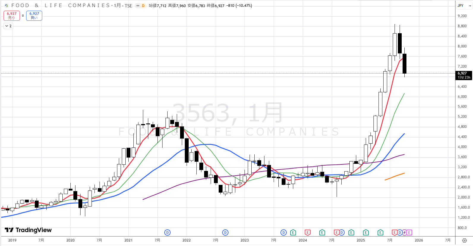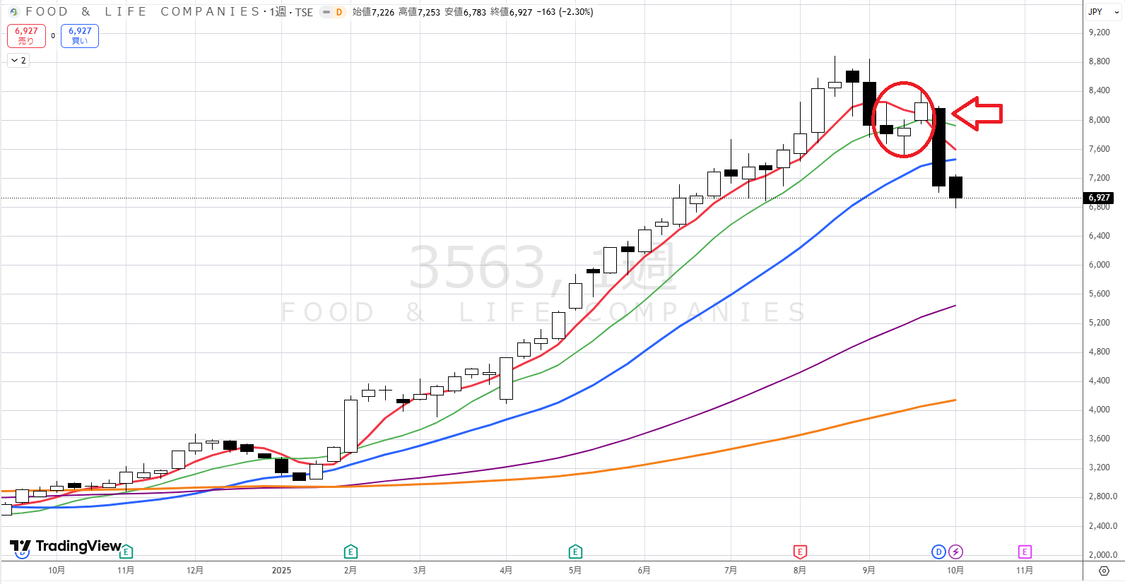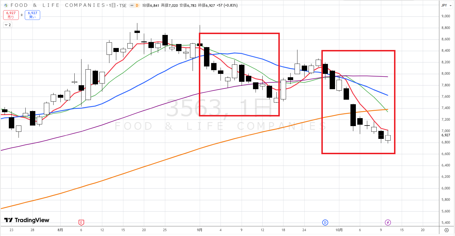 次に日足です。8600円から6800円まで下げています。これは結構儲かります。