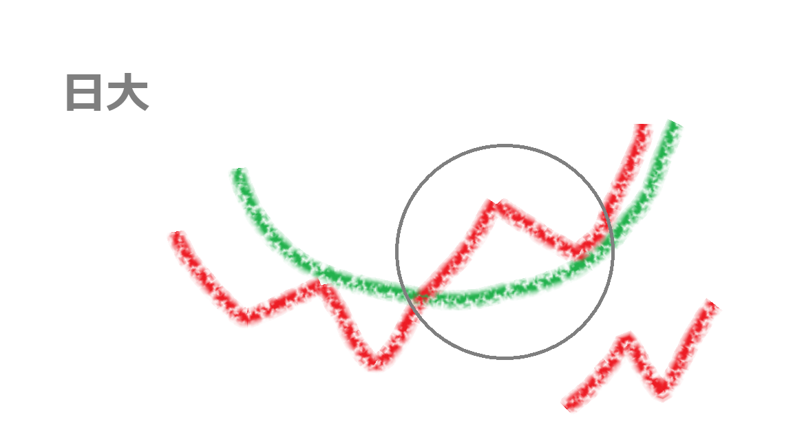 以下の概念図のように緑の線(10日線)が上から下がってきて底を打って上がっていく中、緑の下にあった赤(5日線)が一度緑に当たって、次に緑を超えて行きます。