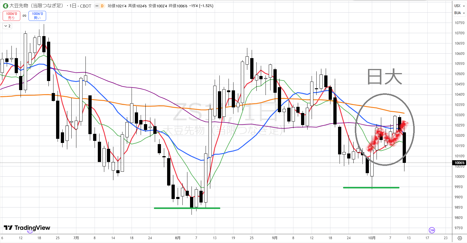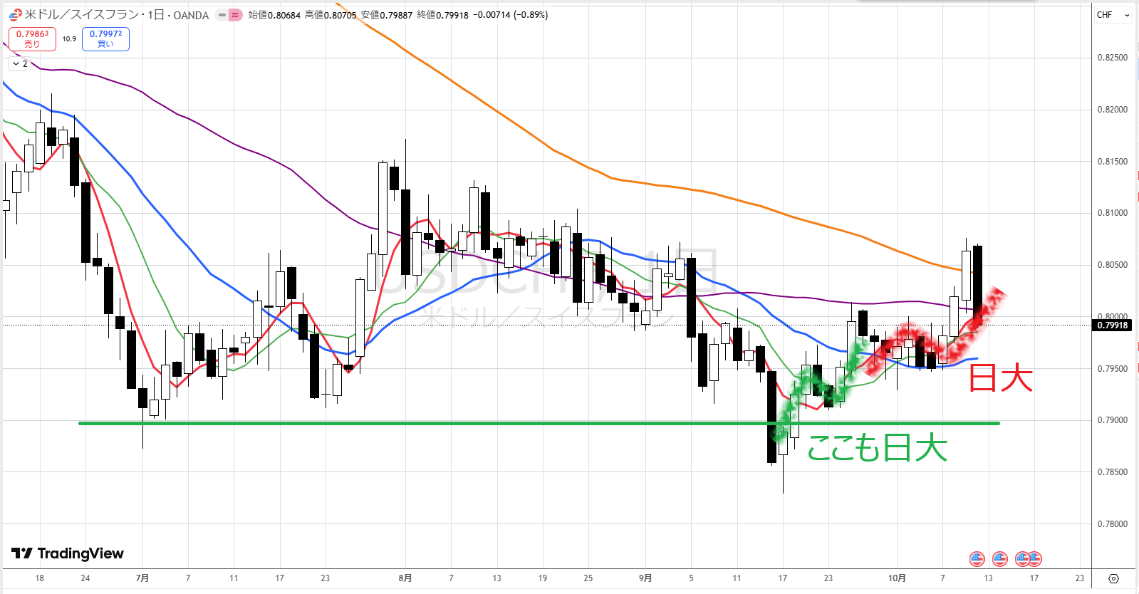 今日(放送日の9日)は陽線ですが、次に陰線が出たらオレンジの上に出て8本目。