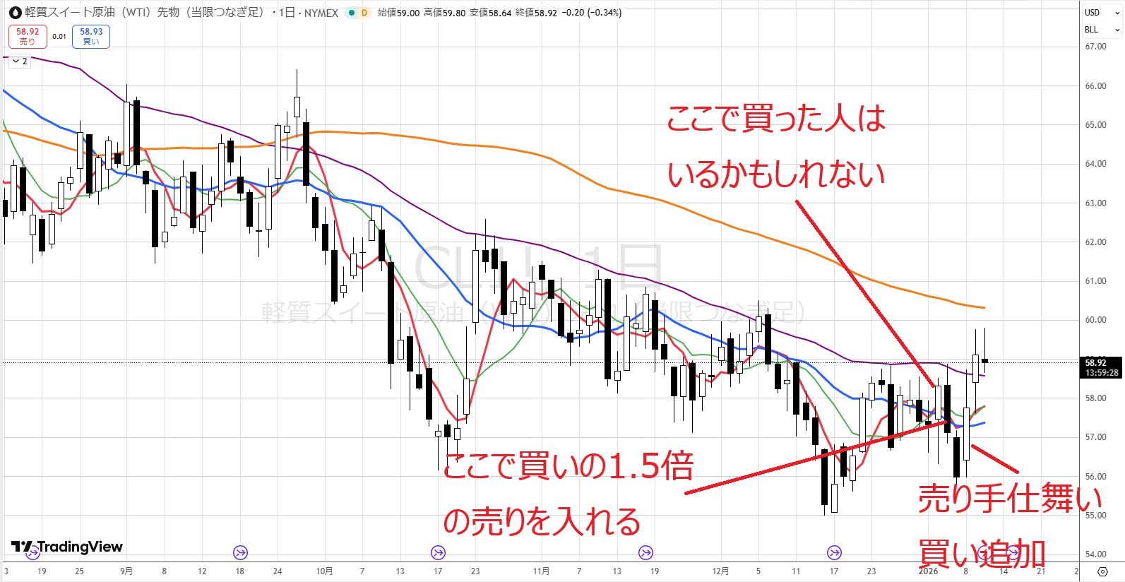 トレードする中で一番ややこし場面が、オレンジを割って長い間下げて、底を打ってオレンジに向かう間です。