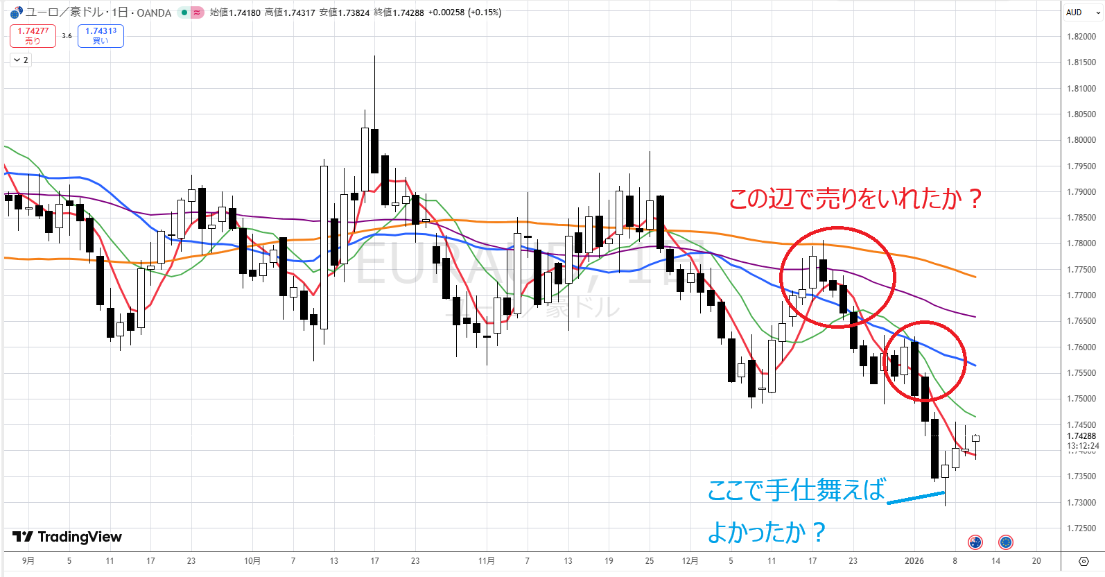 ずっと観察を続けていたユーロ豪ドル、やっと安心できる下げになってきました。集中しすぎてポンド豪ドルが先に下げていたことに気づきませんでした。