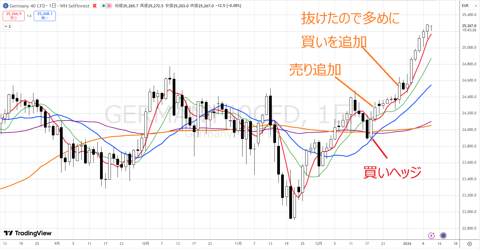 オレンジまで上がってきて逆下半身が出たから、買いを手仕舞って売りを入れた。