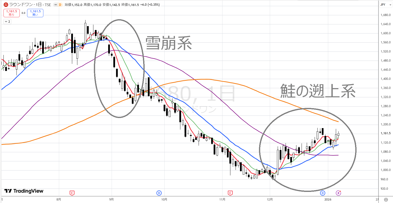 下がるとことは「雪崩系」です。ガラガラと一気に下がります。