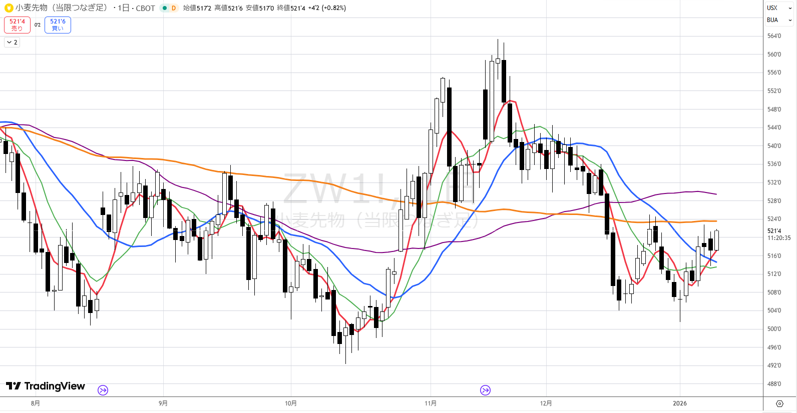 コーンはボックス圏で動いていますので、あまり手を出しにくい値動きです。