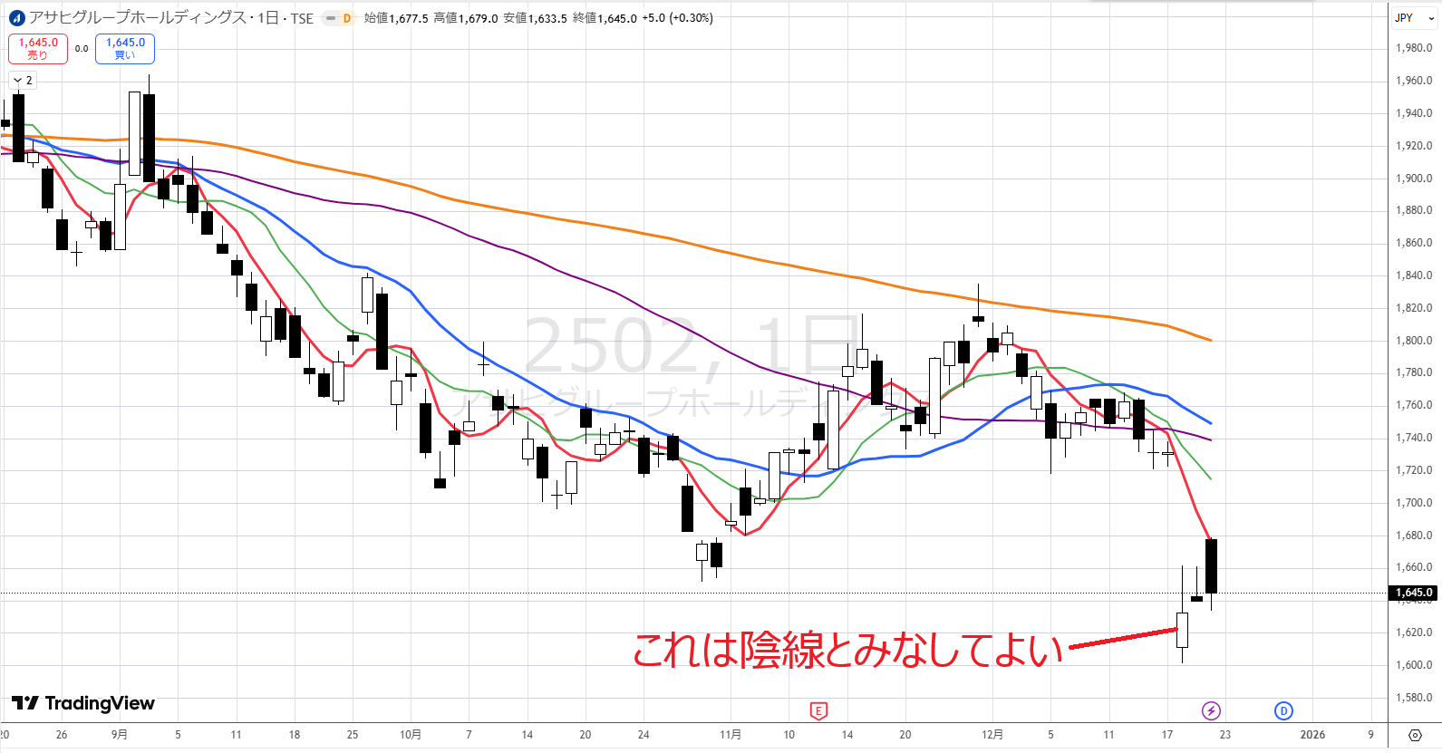 2502アサヒHDは、大きく窓を開けて陽線で終わりましたが、この場合は陰線と捉えてよいのでしょうか?